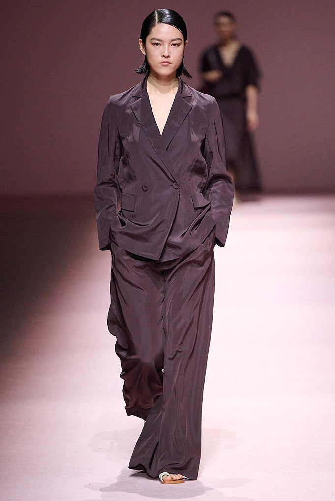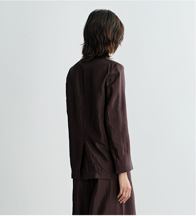 The COMME MOI Lv Yan vintage double-breasted blazer in brown "Electric Light" fabric exudes subtle luxury with its fine sheen and smooth hand-feel. Its excellent drape enhances a refined, composed presence. The retro double-breasted cut paired with fluid tailoring creates a mature, steady silhouette, while the classic notch lapel adds a poised, professional touch.