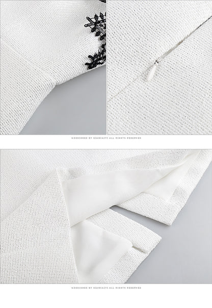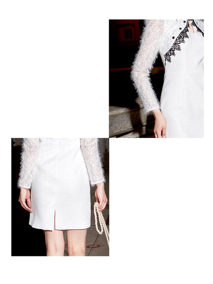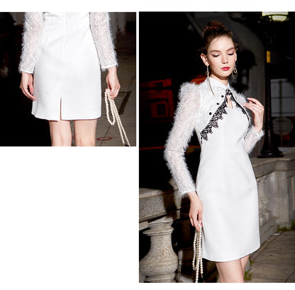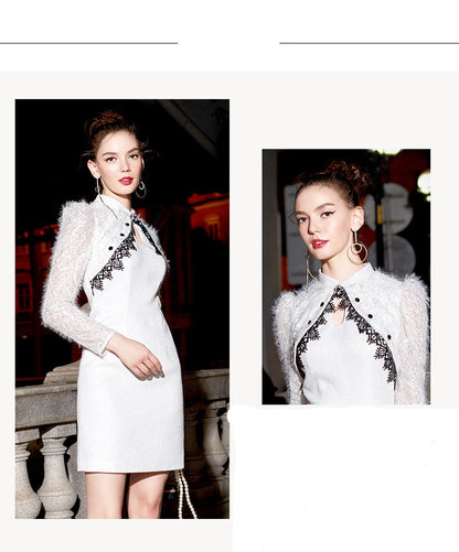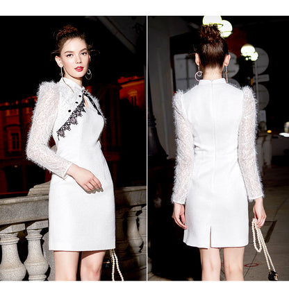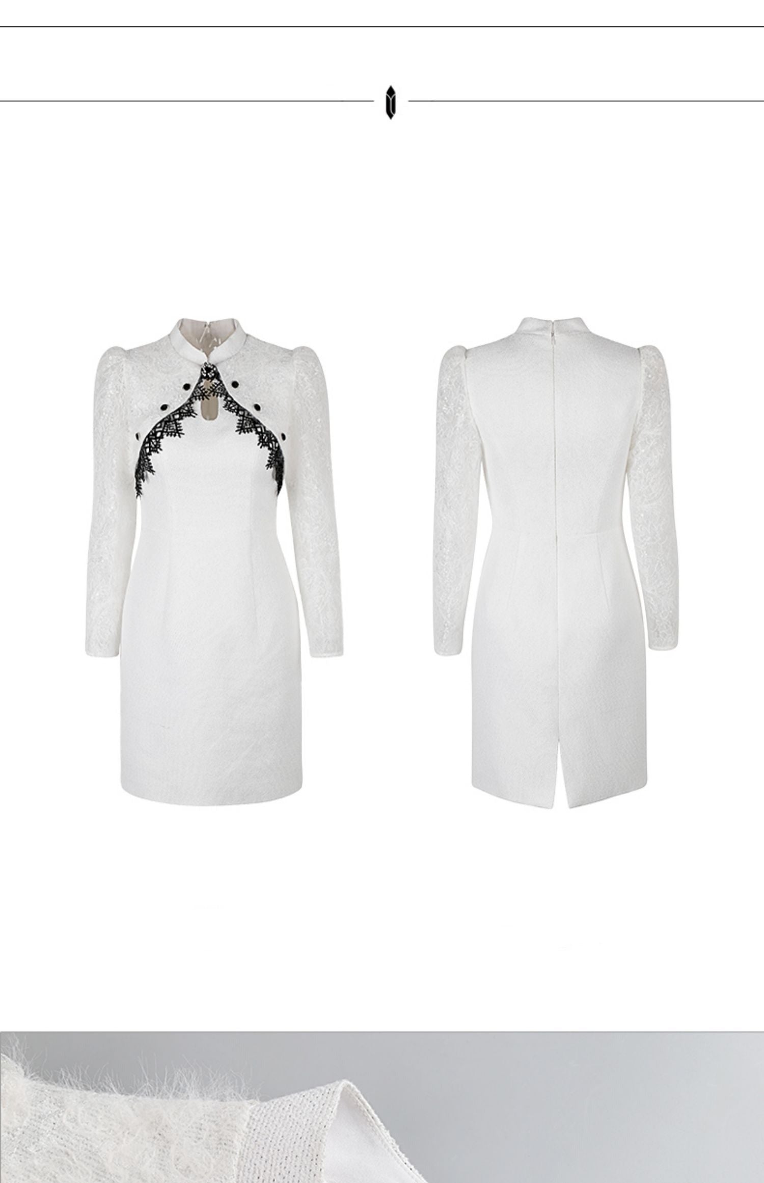 This spring, look effortlessly chic with a fashionable stand-collar, long-sleeve dress featuring high-end details.