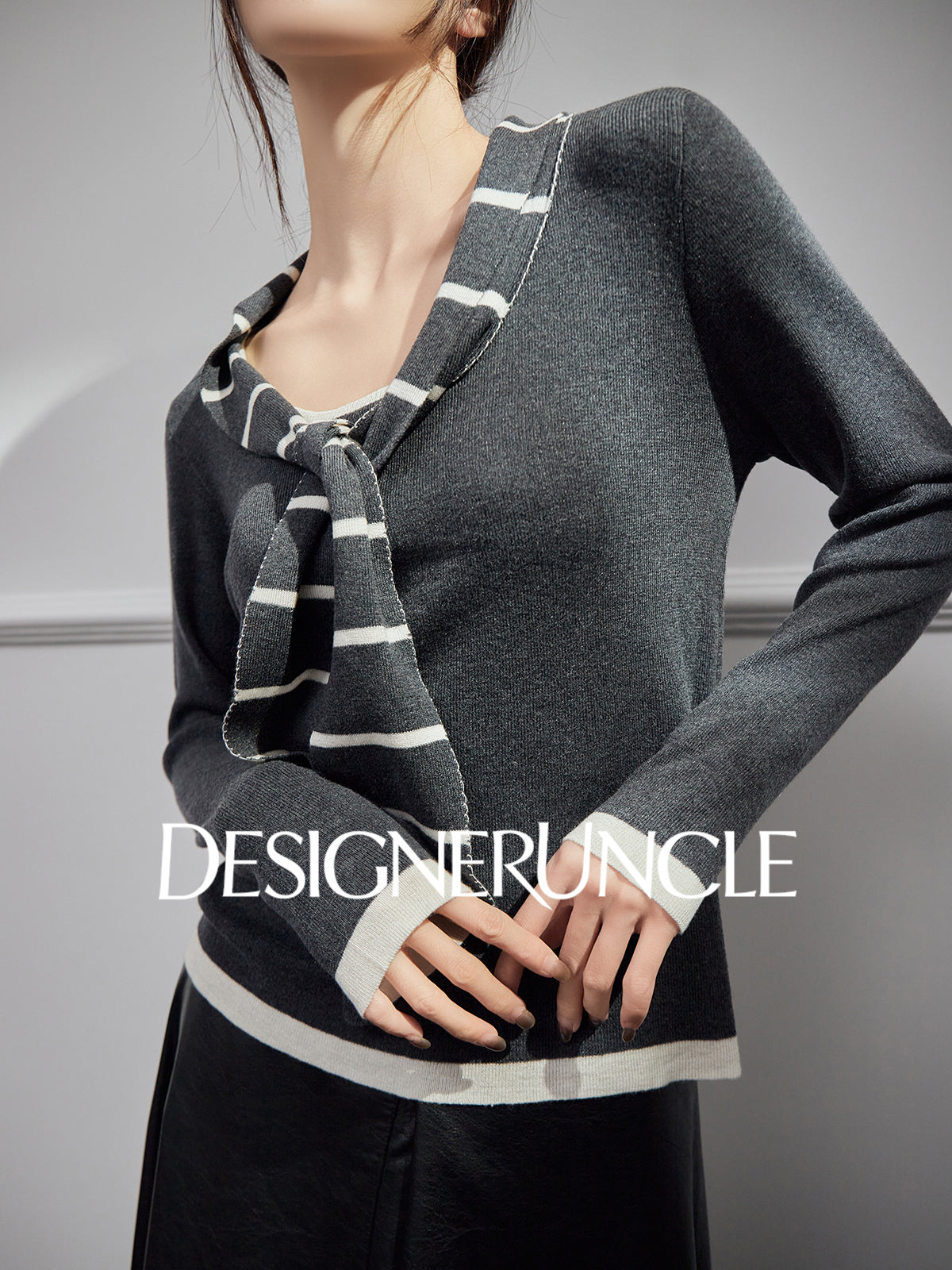 DGU| Dark Gray Striped Bow Tie Niche Design Retro Gentle Commuter Top - Antonio.