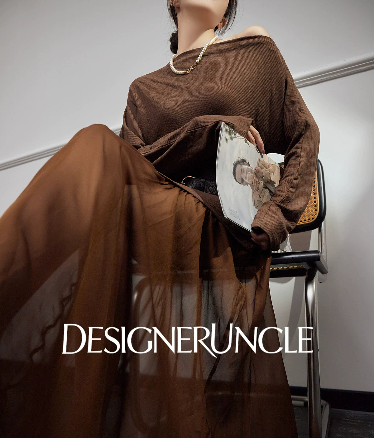 The DGU "Qitu" long skirt introduces contemporary design through its distinctive asymmetrical shoulder detail, creating visual intrigue and modern sophistication. This architectural element adds dimension to the silhouette while the slim cut delivers refined proportions that elongate the frame. Rendered in rich coffee tones, the skirt pairs effortlessly with both fitted and oversized tops, offering styling versatility. The high-end construction utilizes premium fabrics that drape beautifully while maintaining shape through wear.