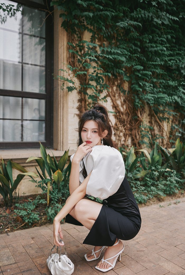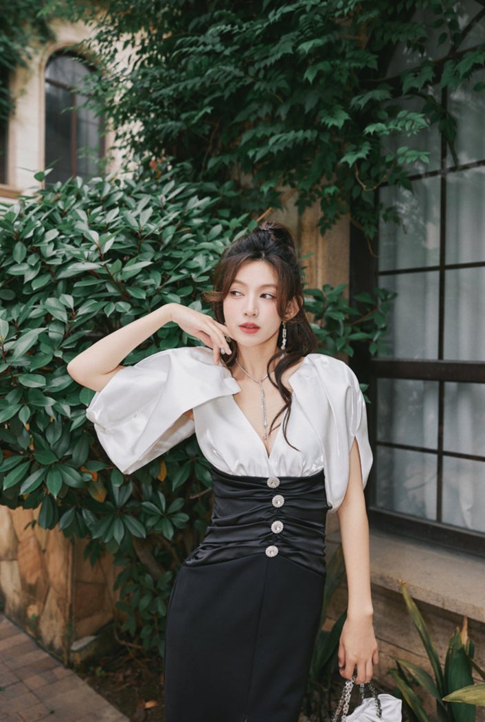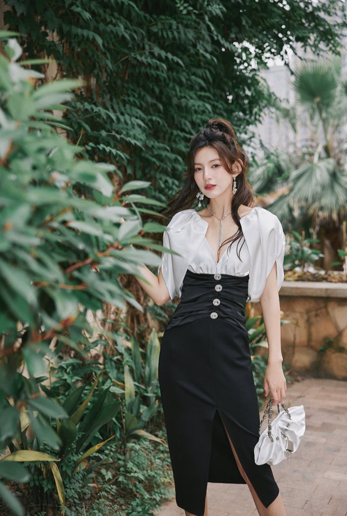 Introducing the DOLLY Elegant Black and White Office Dress, featuring a deep V-neck and short puff sleeves for a slim and sophisticated fit. Elevate your style with this elegant dress, perfect for any office setting. Embrace luxury and exclusivity with this must-have piece from the collection.