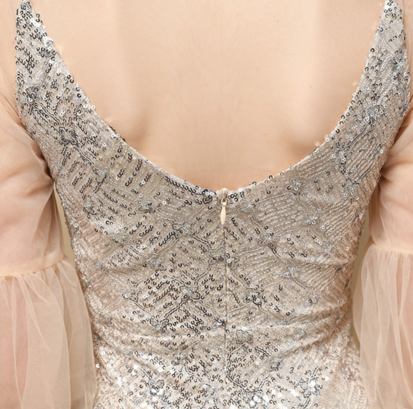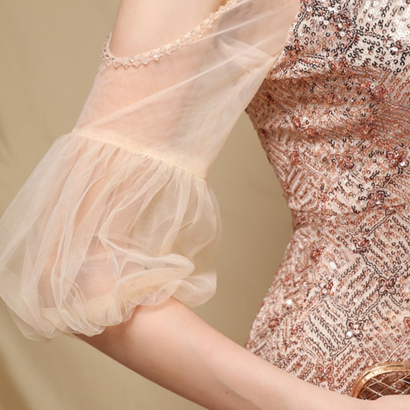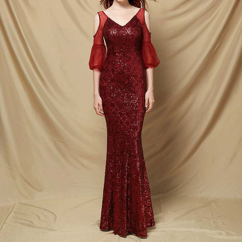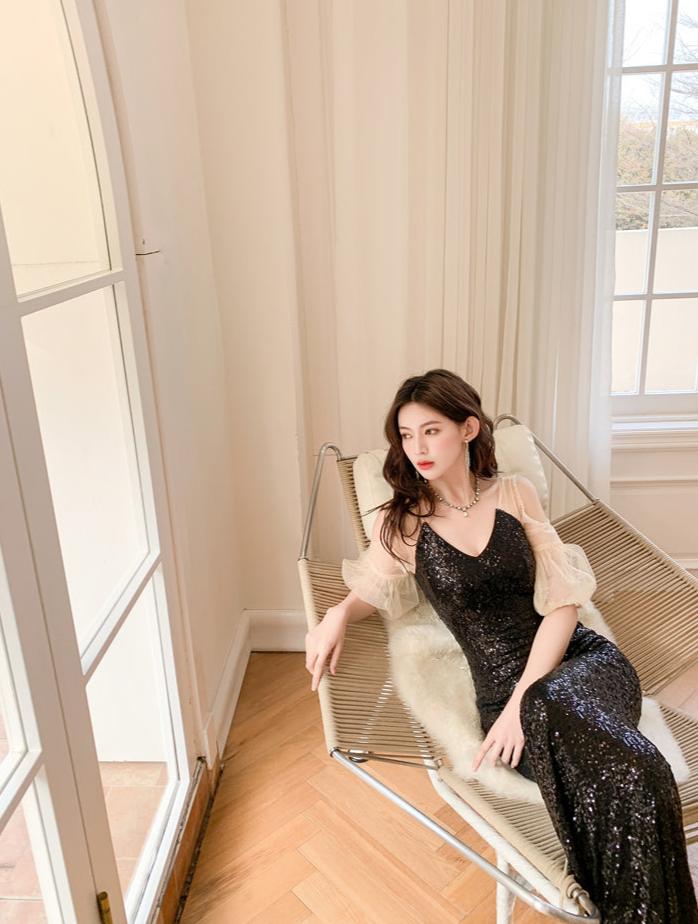 DOLLY Elegant Black Glitter Mesh Long Puff Sleeve Sequin Evening Dress-NUNU