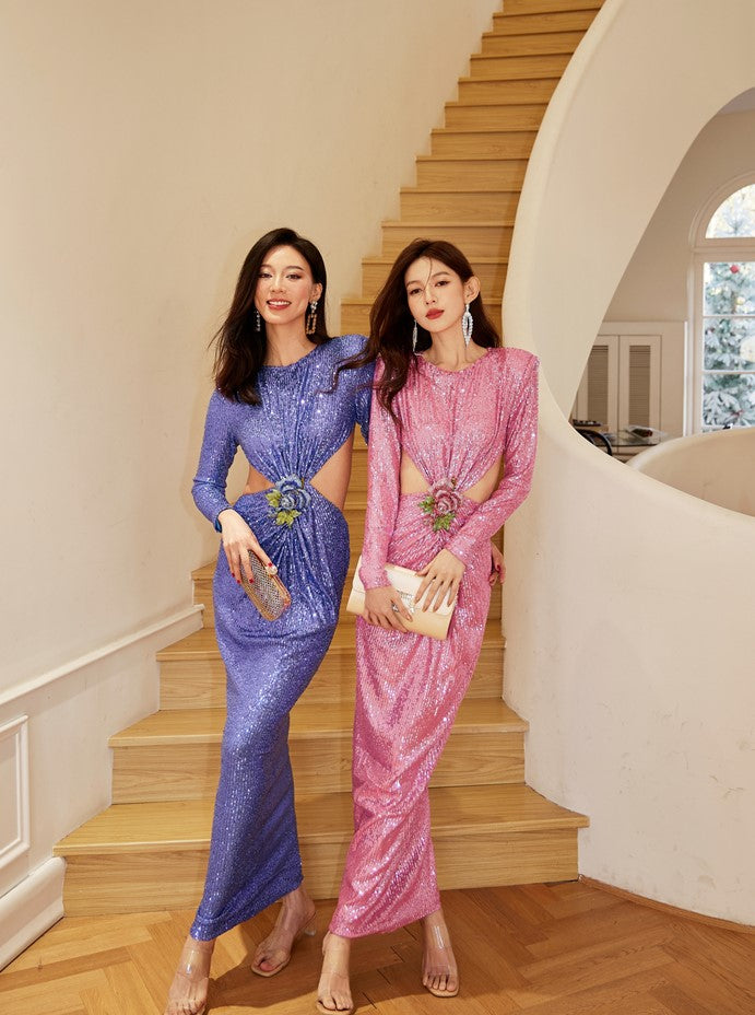 Indulge in elegance with our DOLLY Elegant Crew Neck Long Sleeve Slim Fit Sequin Long Evening Dress-IIANA. This dress combines a sexy silhouette with stunning sequin detailing for a truly glamorous look. Perfect for special occasions, make a statement and feel confident in this dress. (v)