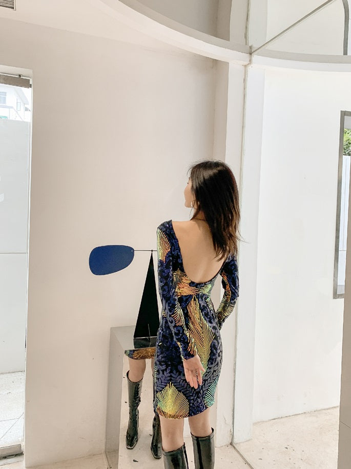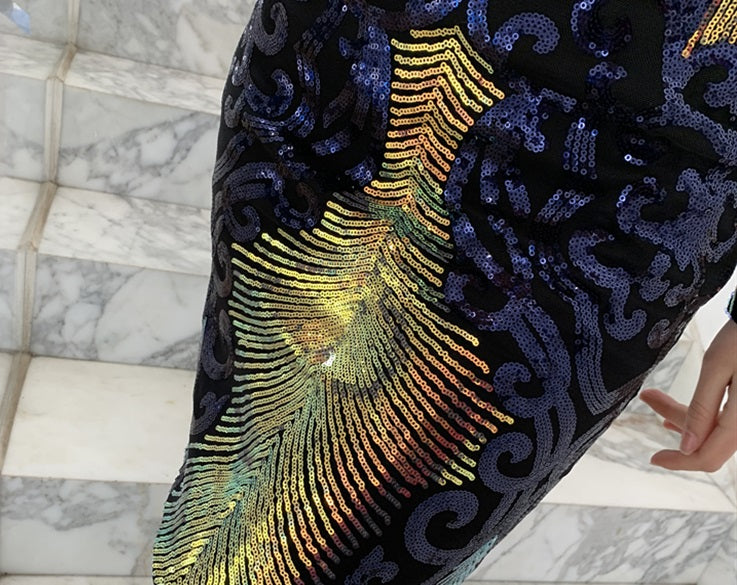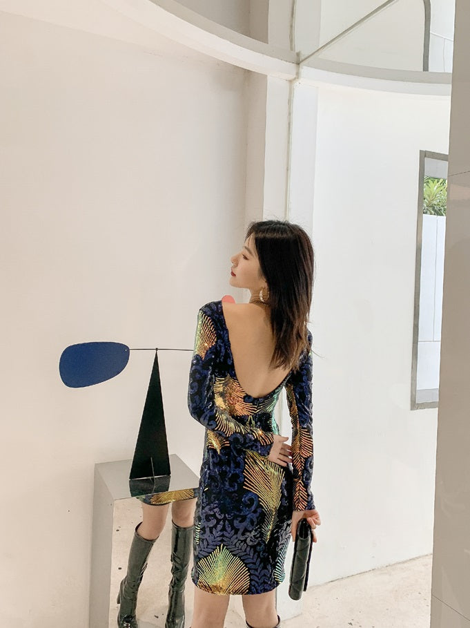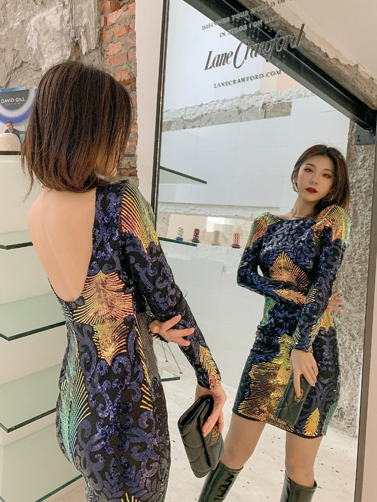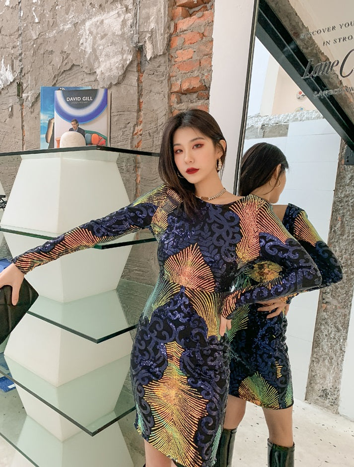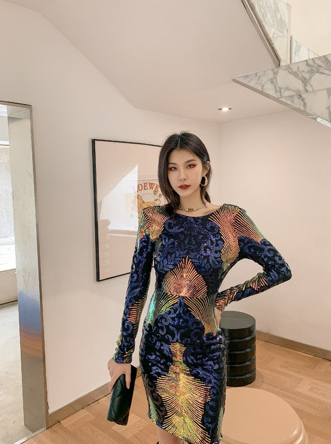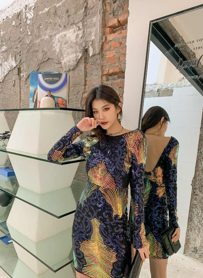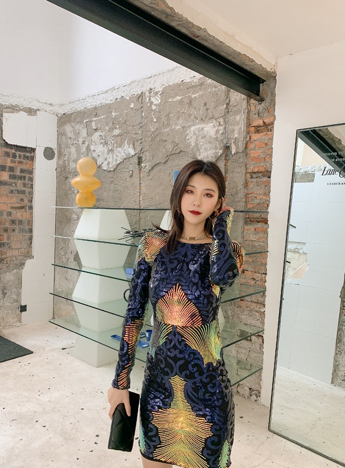 DOLLY Elegant Crew Neck Long Sleeve Slim Fit Short Sequin Party Dress-CONNIE