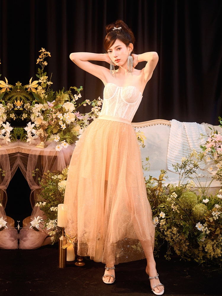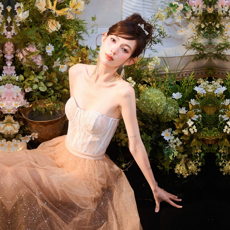 DOLLY Elegant Fake Two Piece Sleeveless Tube Top Sequin Long Dress-POLA