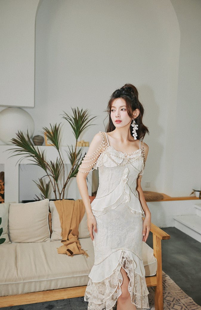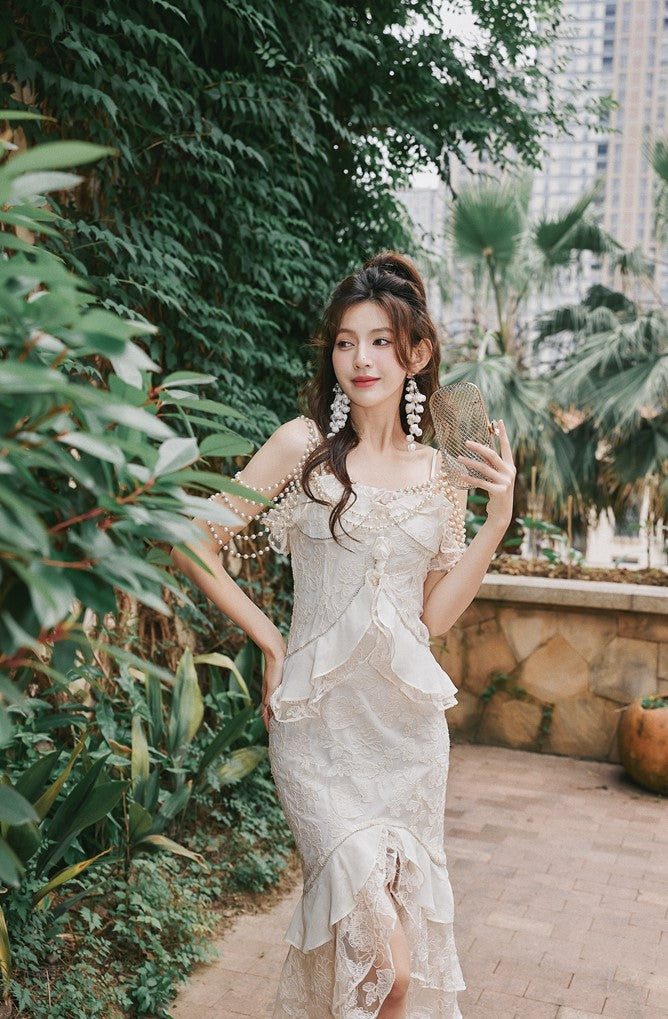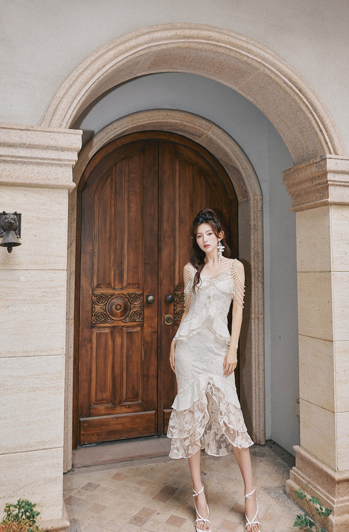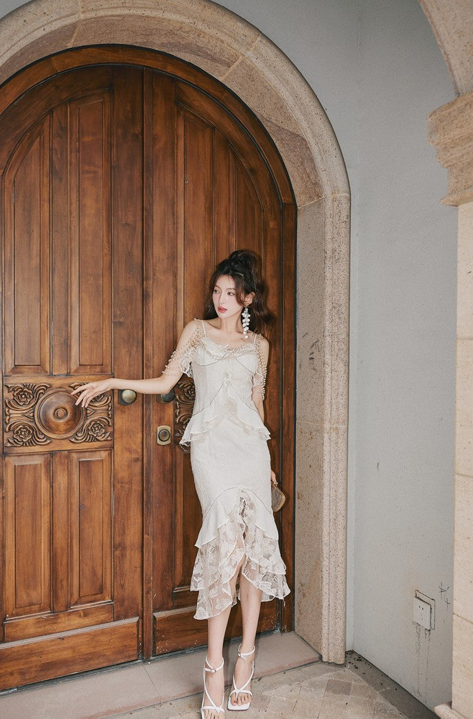 DOLLY Elegant French Style Cream Ruffled Lace Fake Two Piece Midi Dinner Dress-KAKA