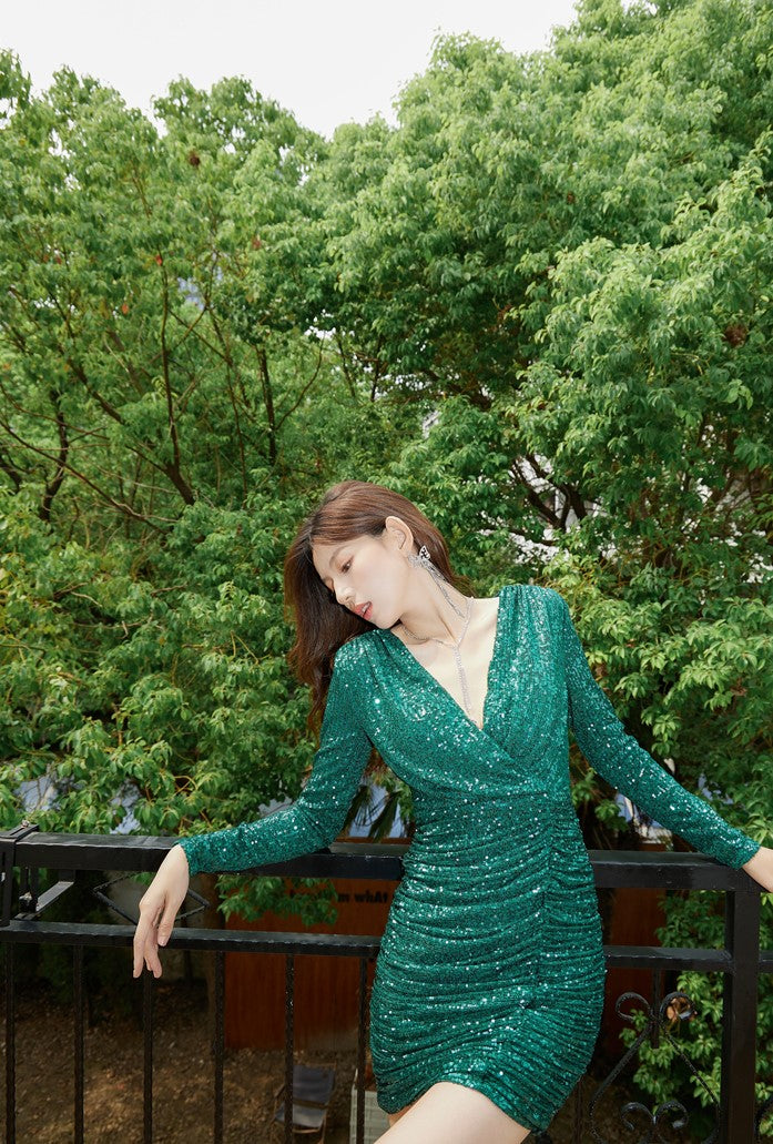 DOLLY Elegant Green V-Neck Long Sleeve Bright Sequin Short Evening Dress-PRISCILLA