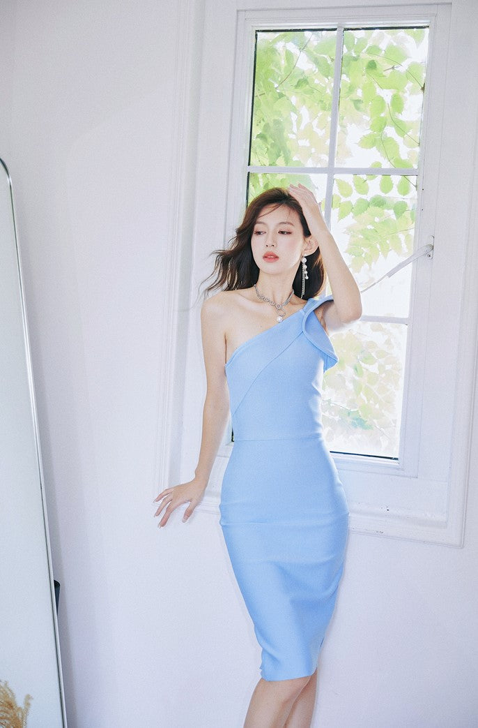 Introducing TABITHA, the ultimate formal dinner dress. This elegant and smart dress features a light blue color with a slant collar and body-hugging midi design. Make a statement with its classy silhouette and command attention at any event. Elevate your style with TABITHA.(v)