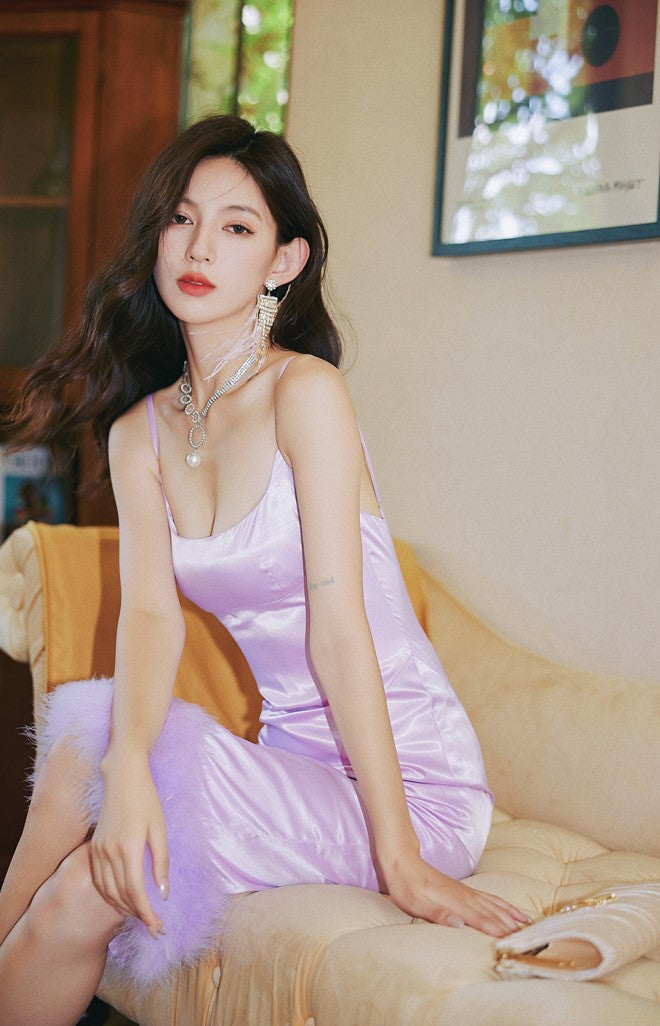 DOLLY Elegant Light Purple French Style Sleeveless Suspender Feather Party Dress-JOLENE