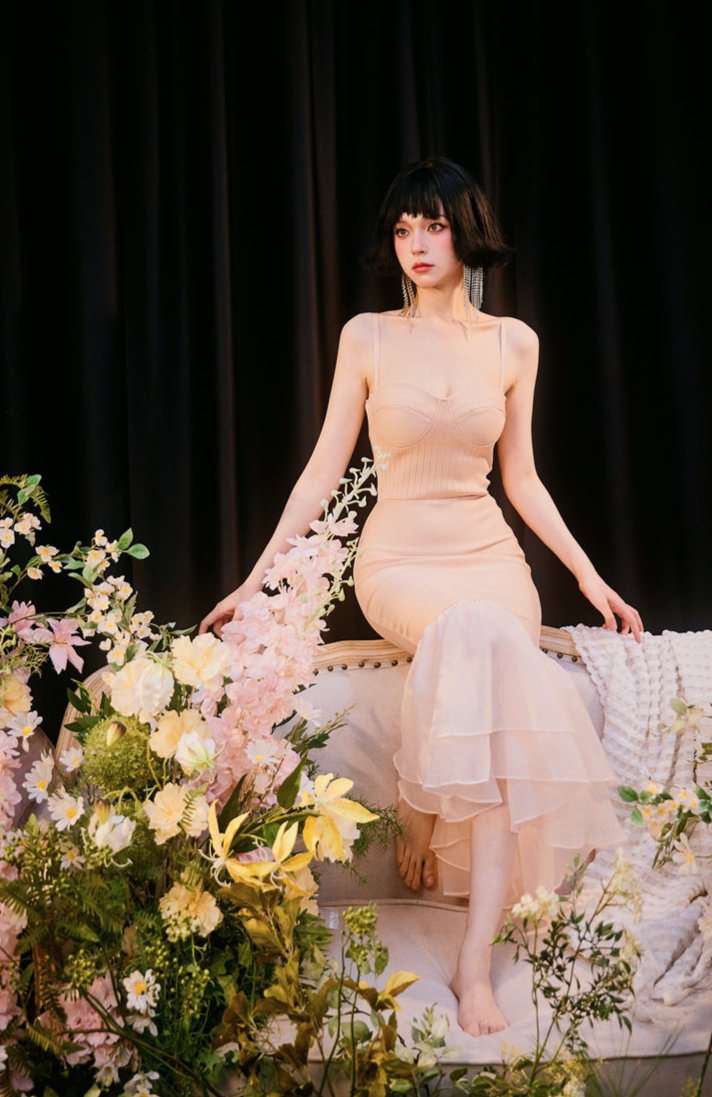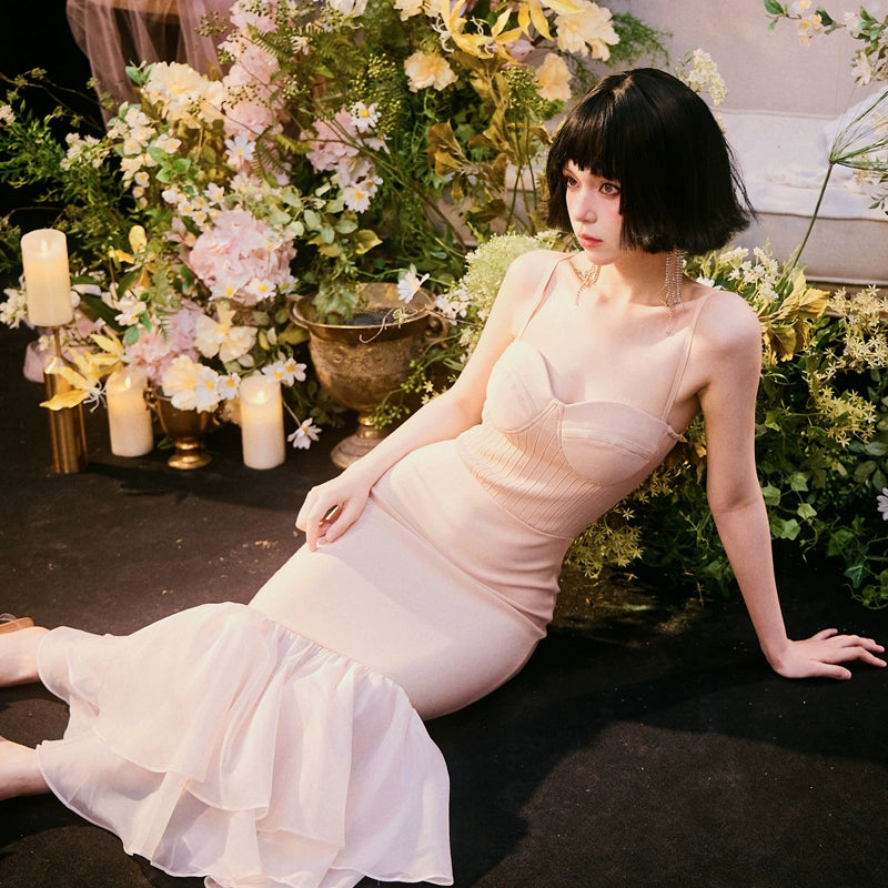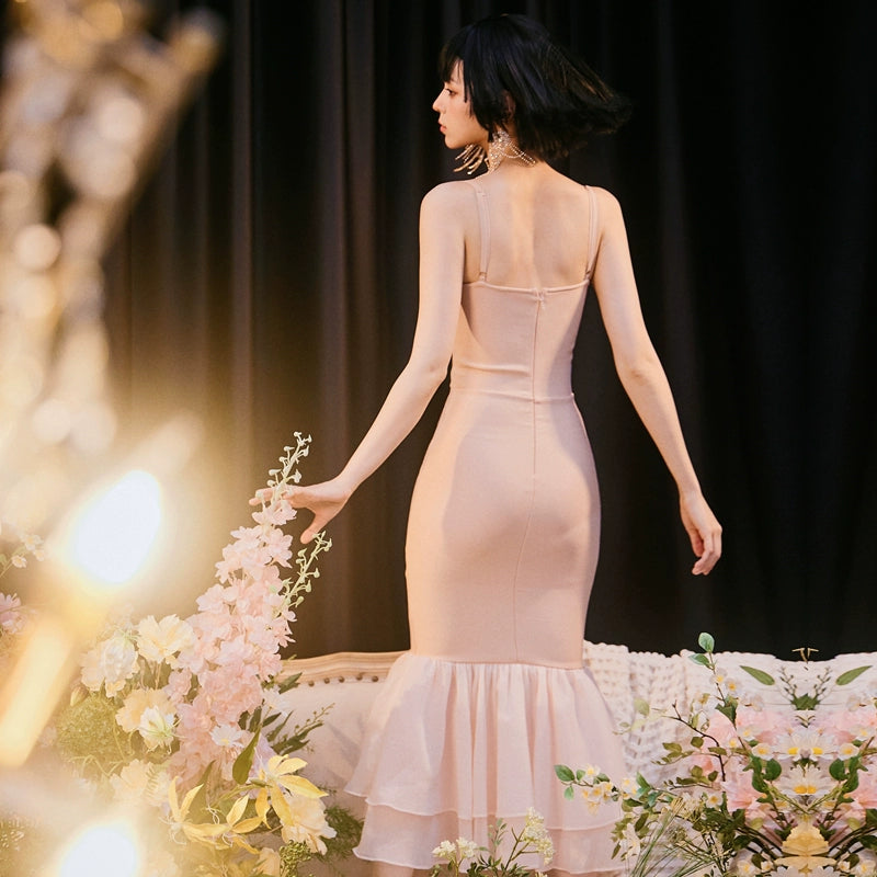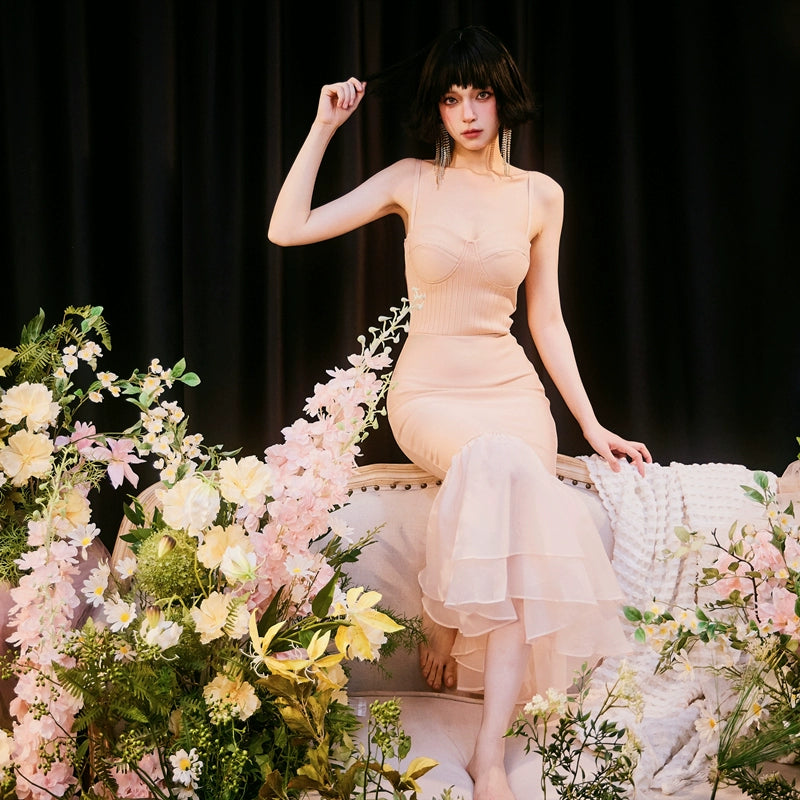 DOLLY Elegant Nude French Style Sleeveless Ruffle Fish Tail Dinner Dress-AMALIA