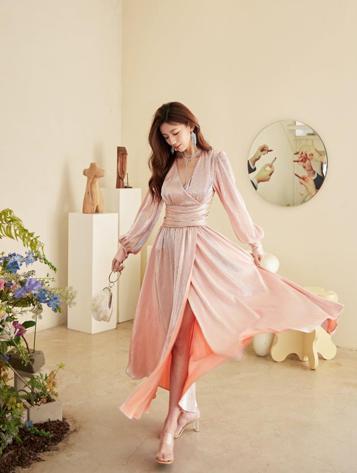 DOLLY Elegant Peach V-Neck Long Puff Sleeve High Waist Long Flowing Guest Dress-BESTY