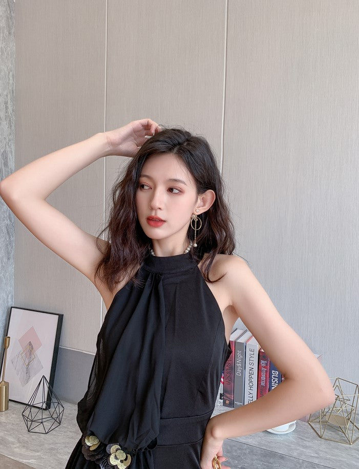 DOLLY Elegant Retro Style Black Sleeveless Halter Neck Long Chiffon Banquet Dress-