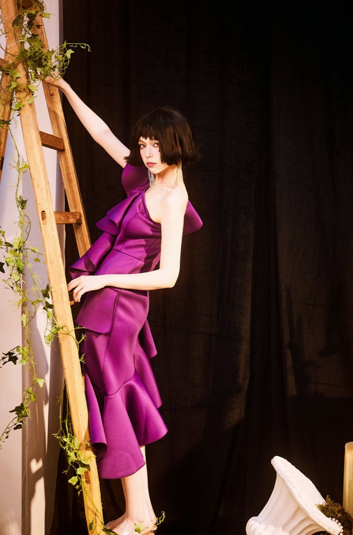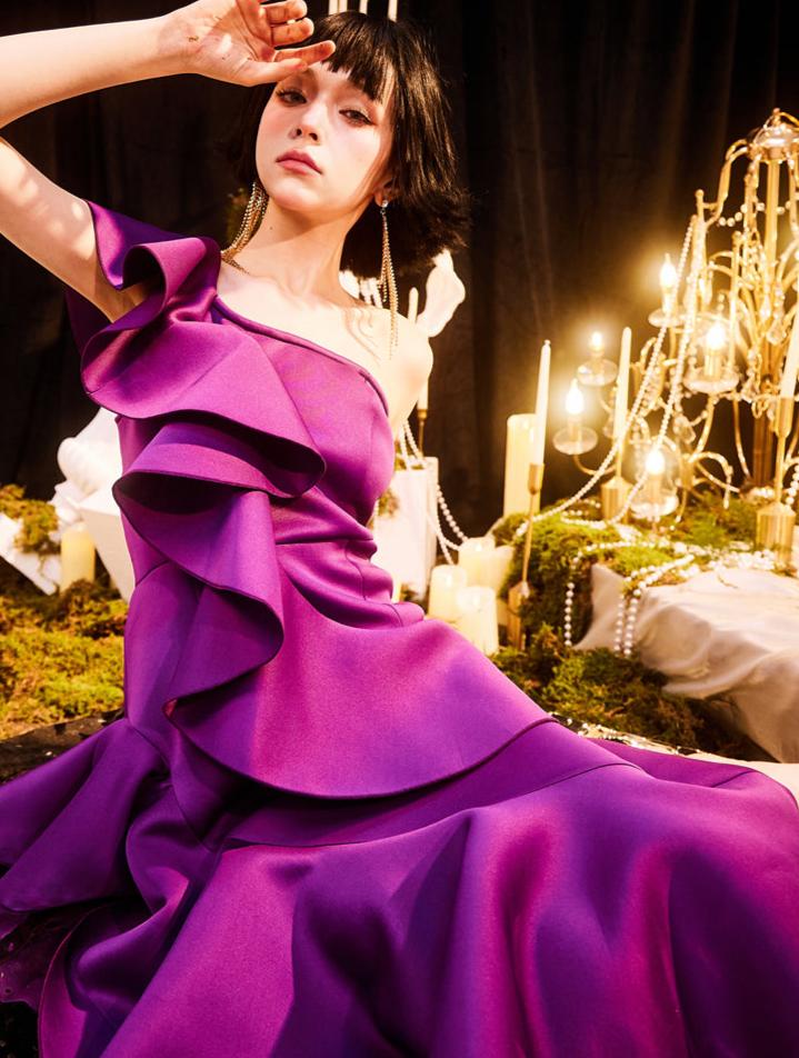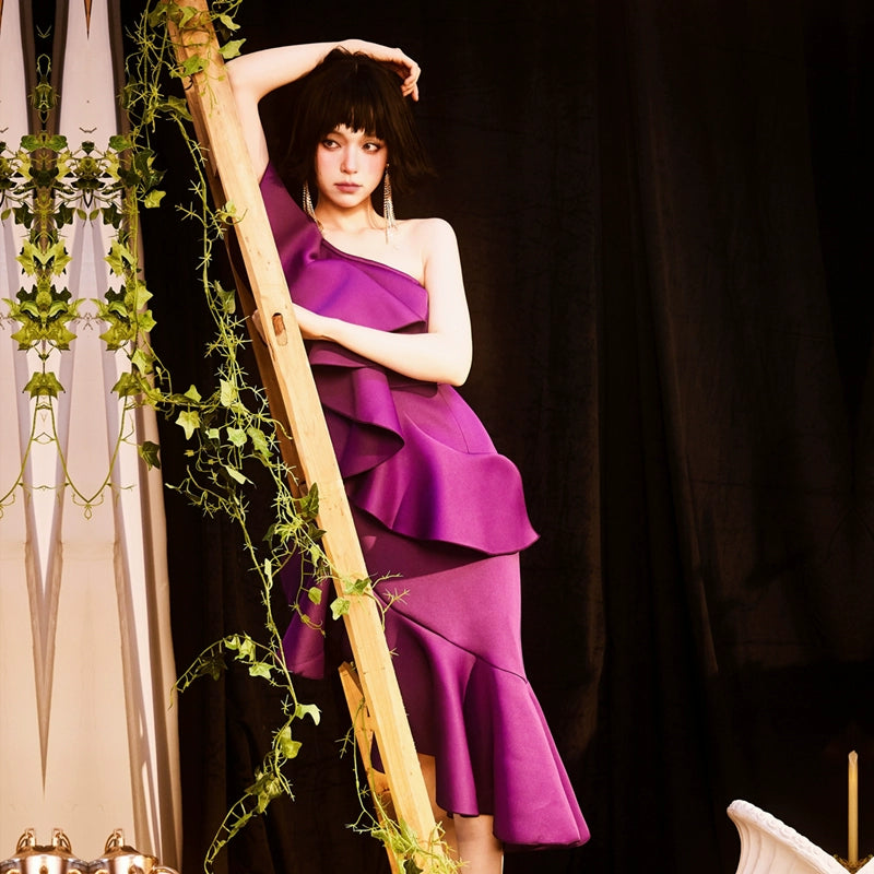 DOLLY Elegant Retro Style Deep Purple Ruffled Off Shoulder Midi Dress-PINKY
