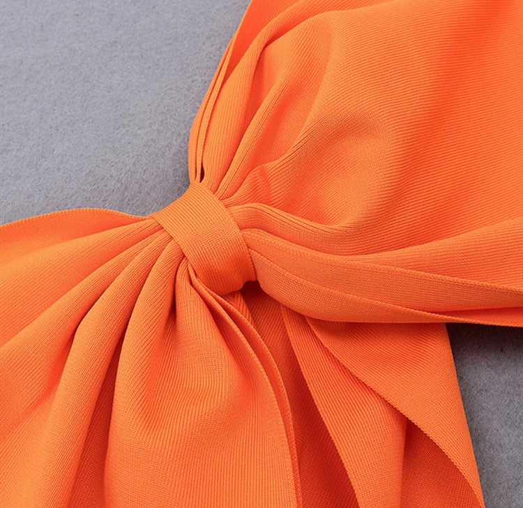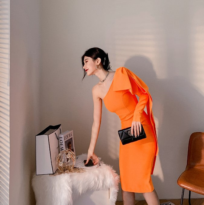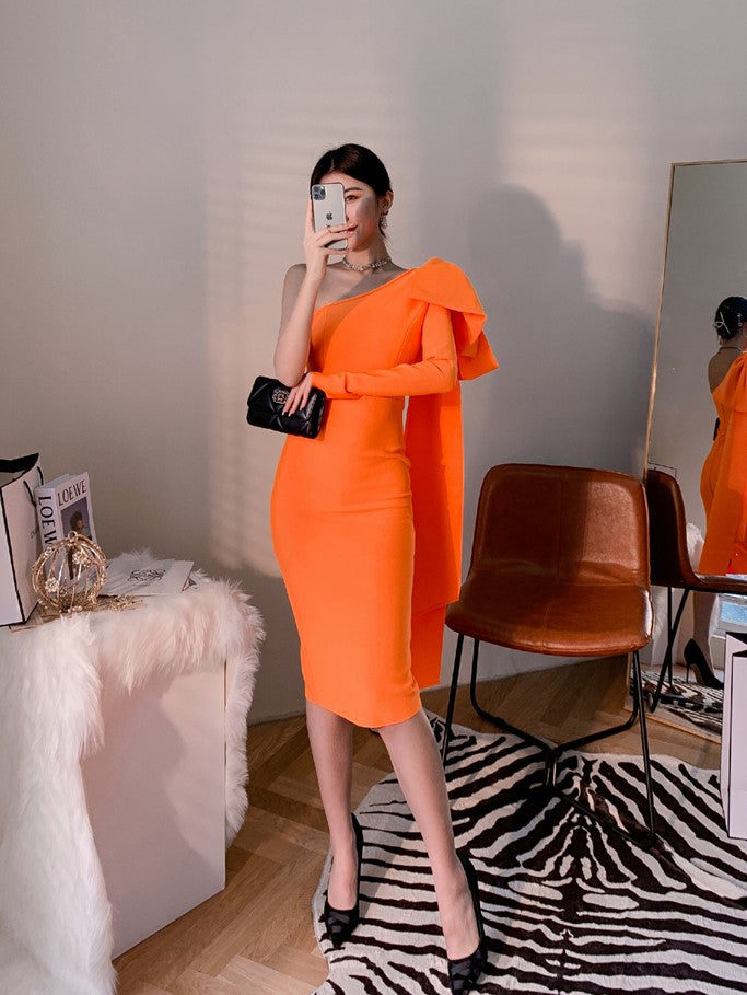 DOLLY Elegant Slant Collar Long Sleeve Bow Drape Body Hug Dinner Dress-CALA