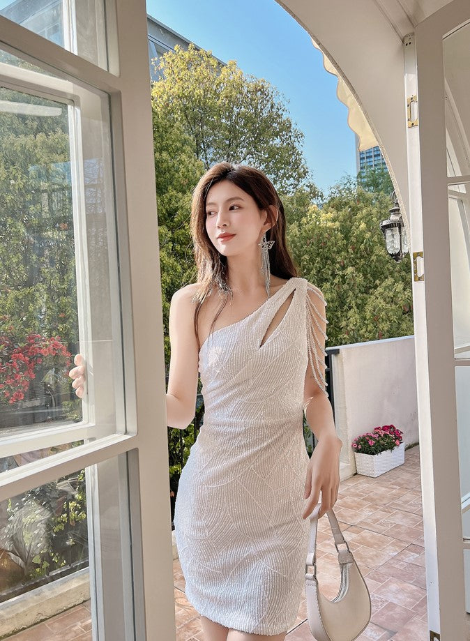 Indulge in elegance and charm with our DOLLY dress. Featuring a slanted collar, sleeveless design, and sexy slim fit, this dress is perfect for any special occasion. The sequin detailing adds a touch of glamour, making you the star of the night. Be the perfect dinner guest with our NANA dress.(v)