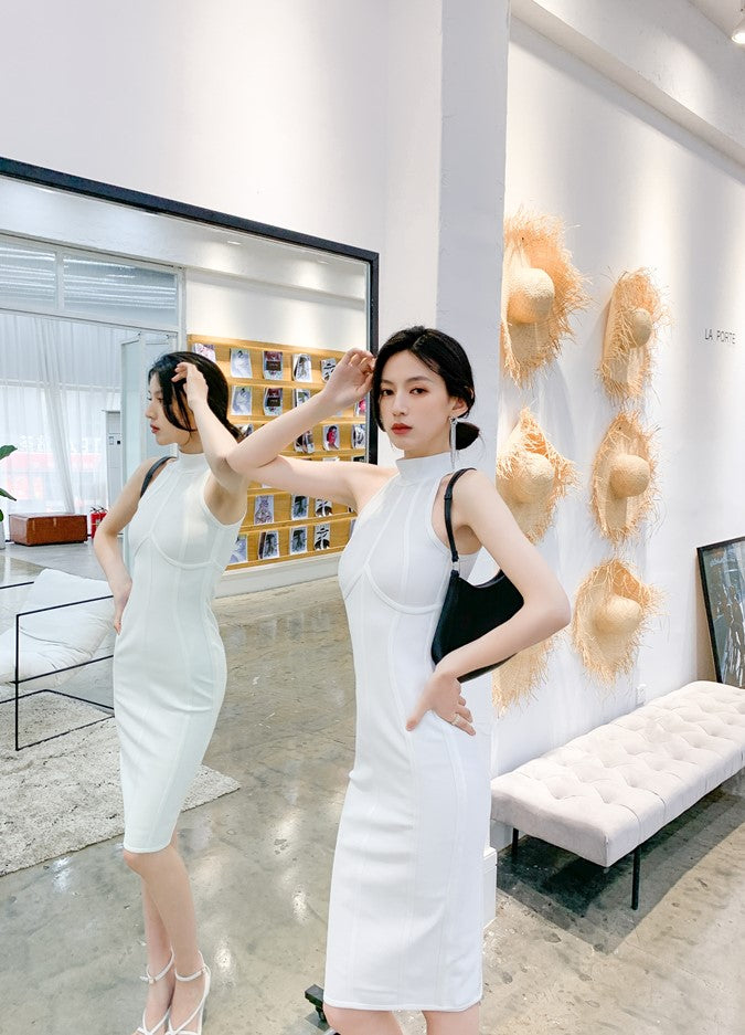 Indulge in luxury with our DOLLY Elegant Sleeveless Stand Collar Dress. The sleek stand collar and body-hugging midi design exude sophistication, perfect for a sexy date night. Elevate your style and make a statement in this exclusive dress.(v)