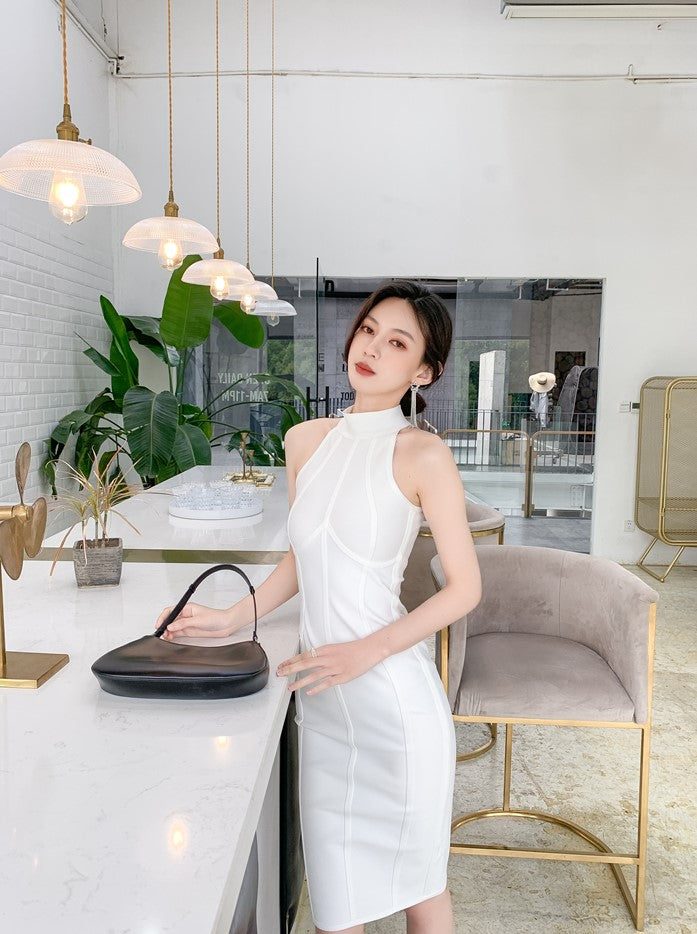 DOLLY Elegant Sleeveless Stand Collar Body Hug Midi Sexy Date Dress-NAT