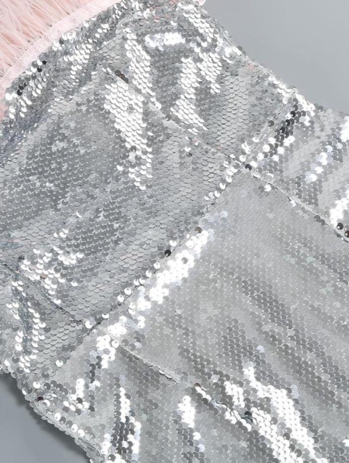 Transform into a vision of elegance with our DOLLY Feather Tube Top Dress. Crafted for exclusive events, this sliver off-shoulder midi dress features a classy silhouette, enhanced by a delicate pink feather trim. Indulge in luxury fashion.
