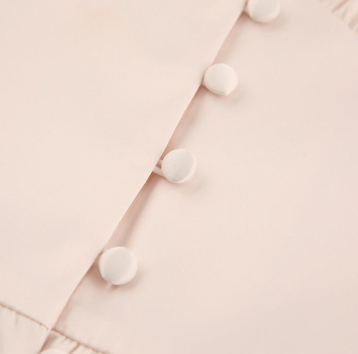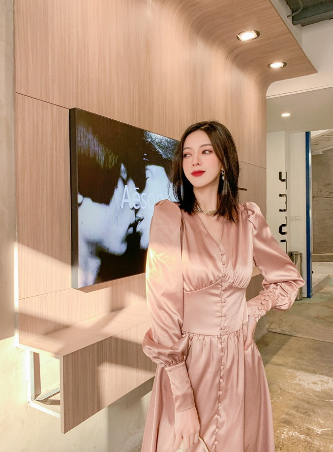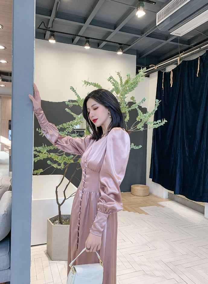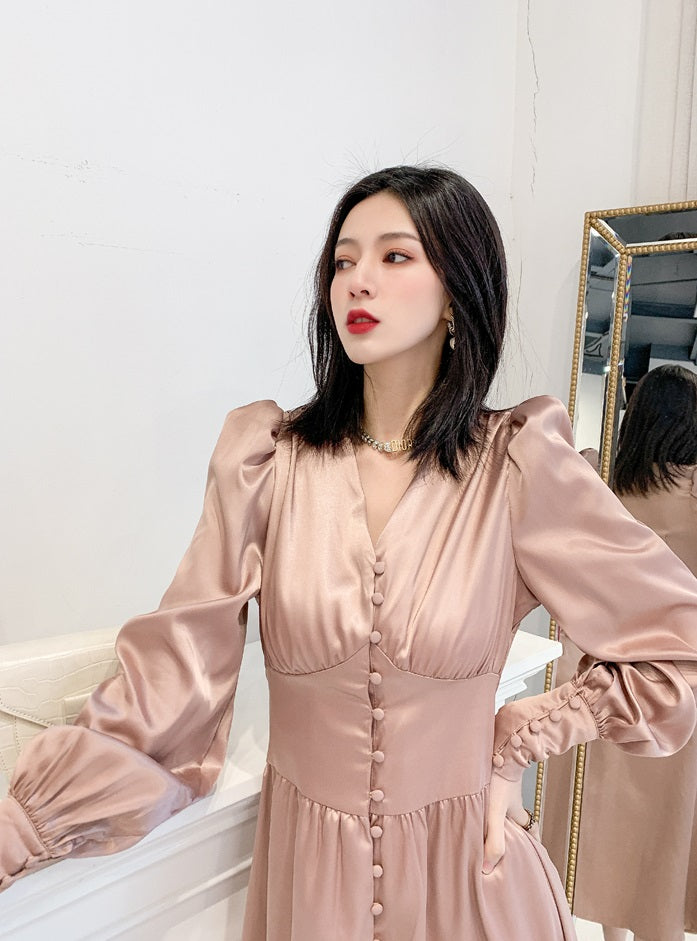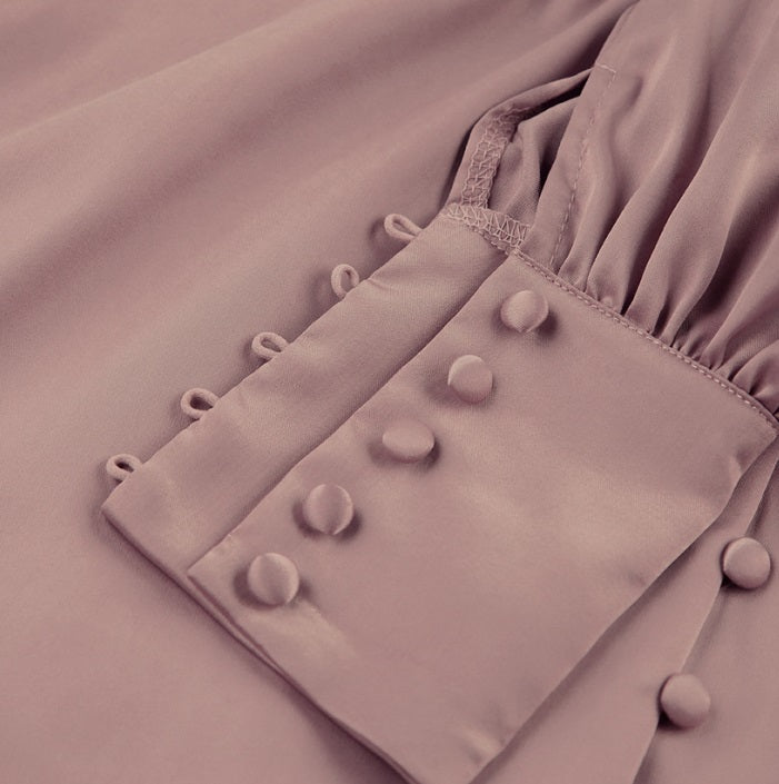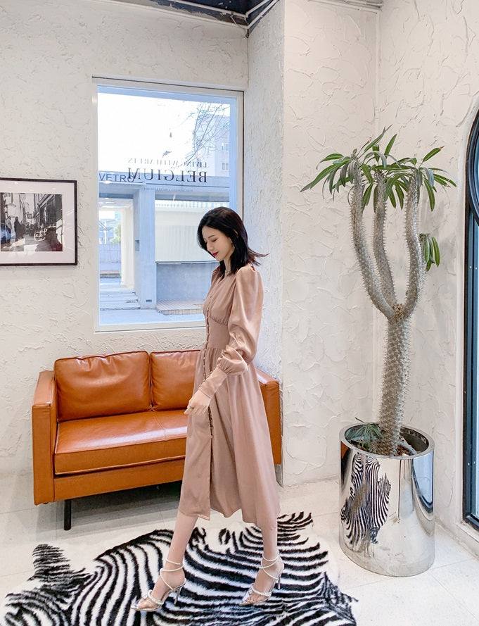 DOLLY Elegant V-Neck Long Lantern Sleeve Long Button Church Dress-NANA