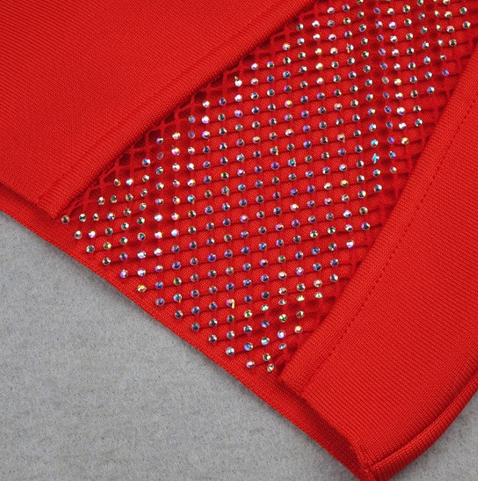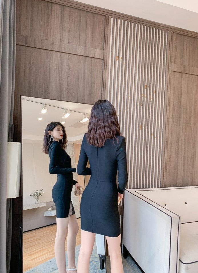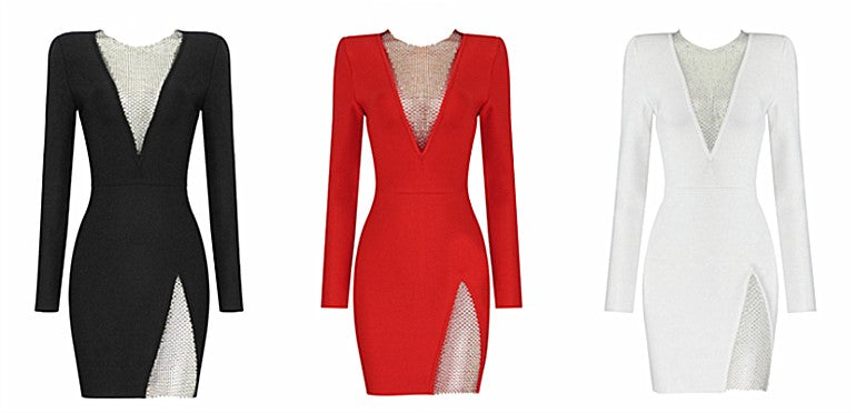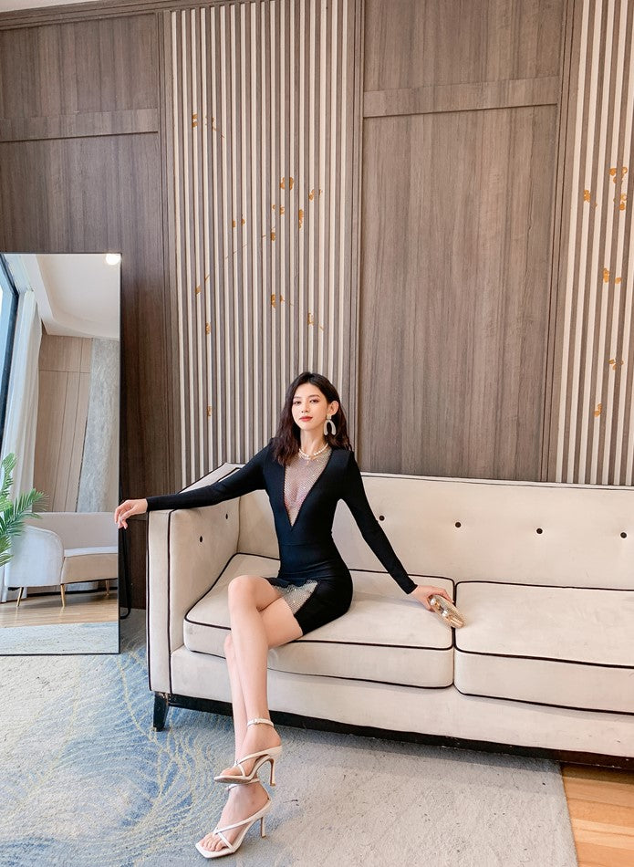 DOLLY Elegant V-Neck Long Sleeve Body Hug Rhinestone Short Sexy Party Dress-ZENA