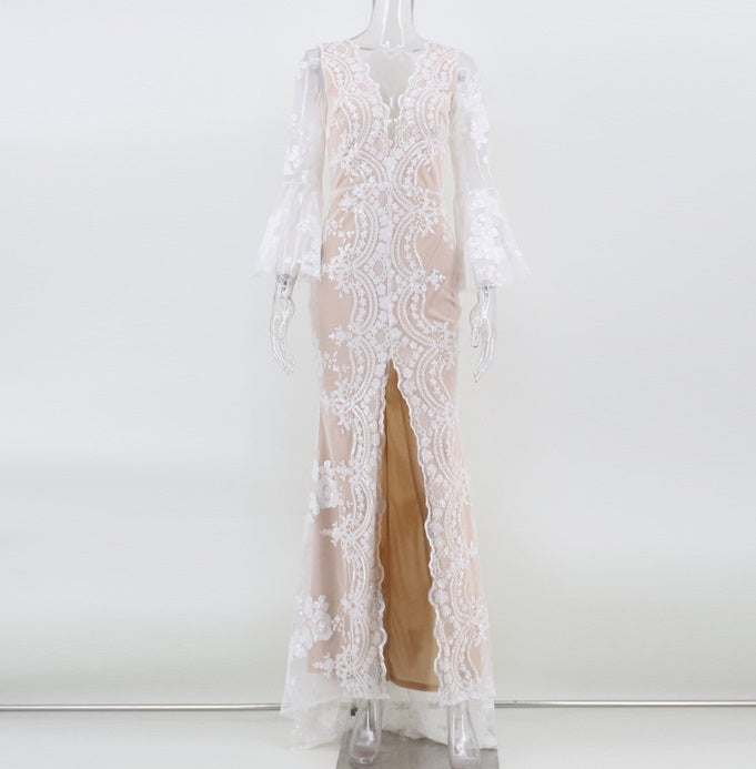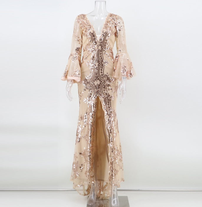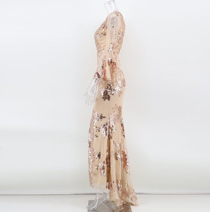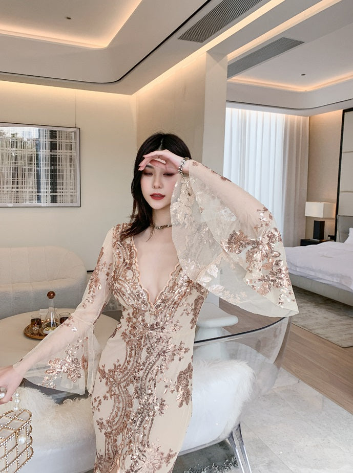 DOLLY Elegant V-Neck Long Sleeve Sequin Hip Flared Fish Tail Banquet Dress-MAY