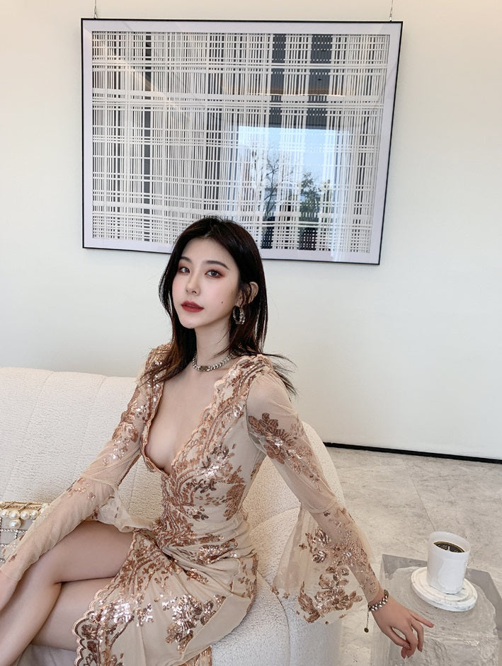 Elevate your style with our DOLLY Elegant V-Neck Long Sleeve Sequin Dress. Its classy design brings sophistication to any event. The sequin detailing adds a touch of glamour, while the hip-flared fish tail silhouette creates a feminine and elegant look. Perfect for a luxurious and exclusive banquet.