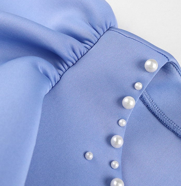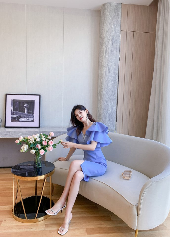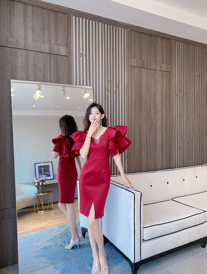 DOLLY Elegant V-Neck Short Ruffle Sleeves Slim Fit Midi Slit Office Dress- ilLA