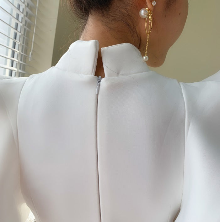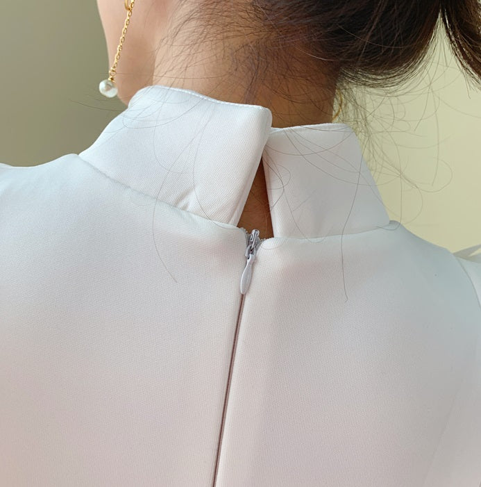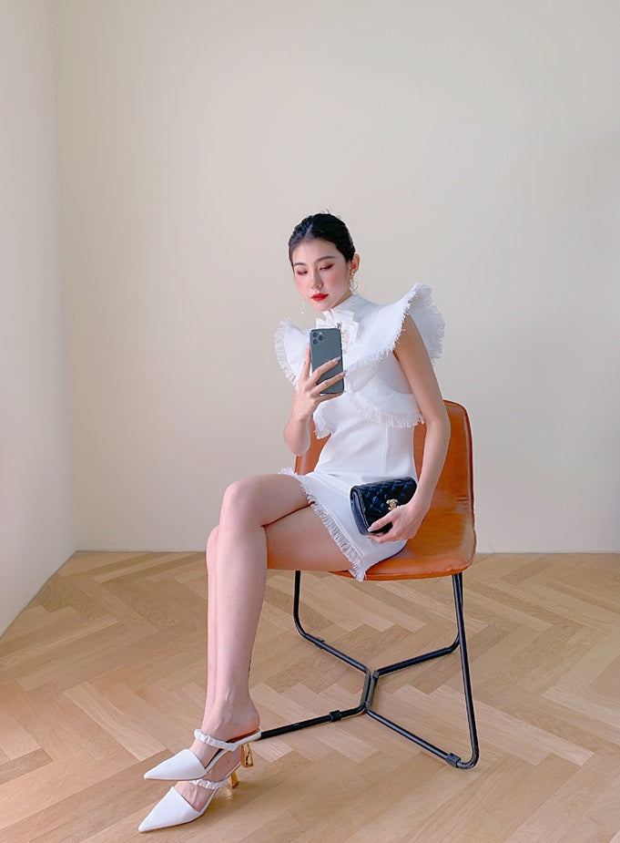 DOLLY Elegant White/Black Stand Collar Short Sleeve Slim Fit Short Fringe Dress-FRIYA
