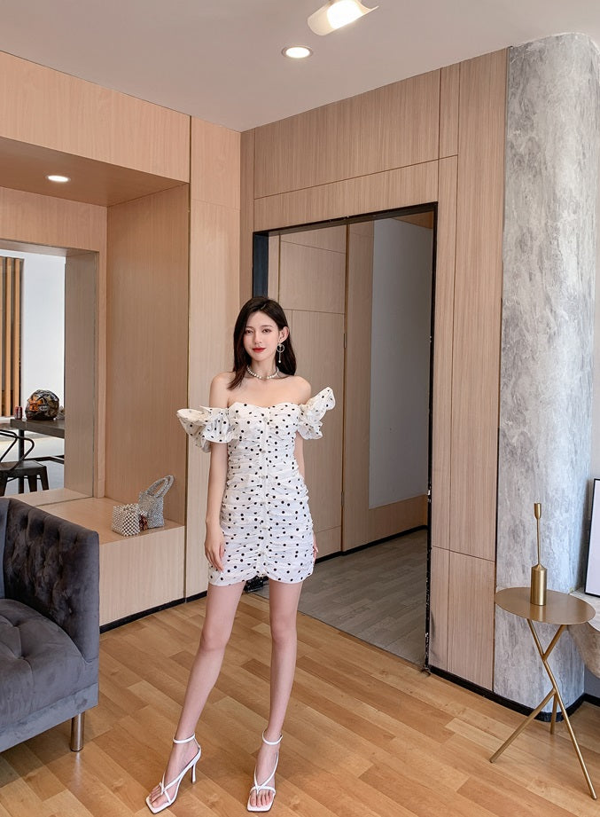 DOLLY Elegant White Off Shoulder Short Puff Sleeve Slim Fit Short Polka Dot Dress-MINA