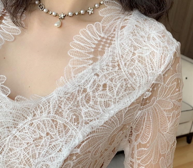 DOLLY Elegant White V-Neck Long Sleeve High Waist Peplum Short Date Dress-LOUIS