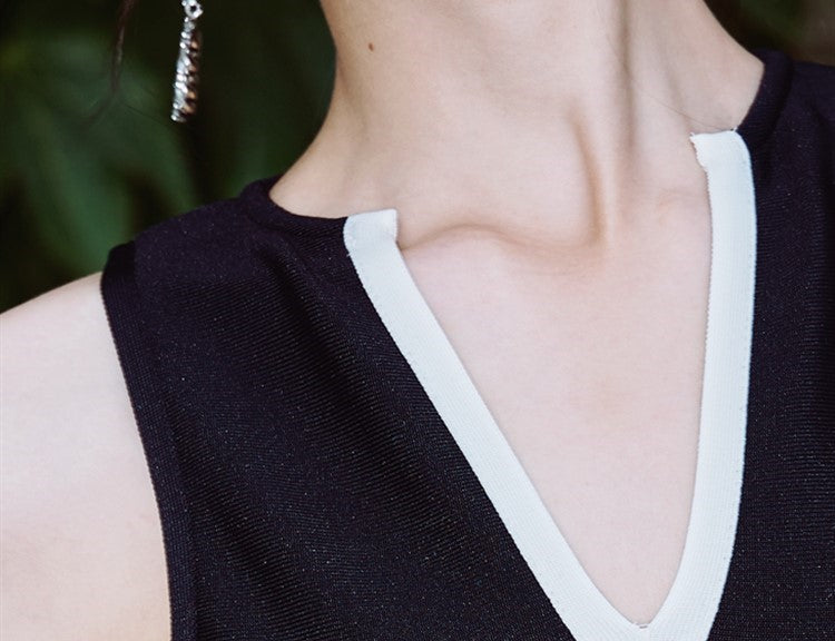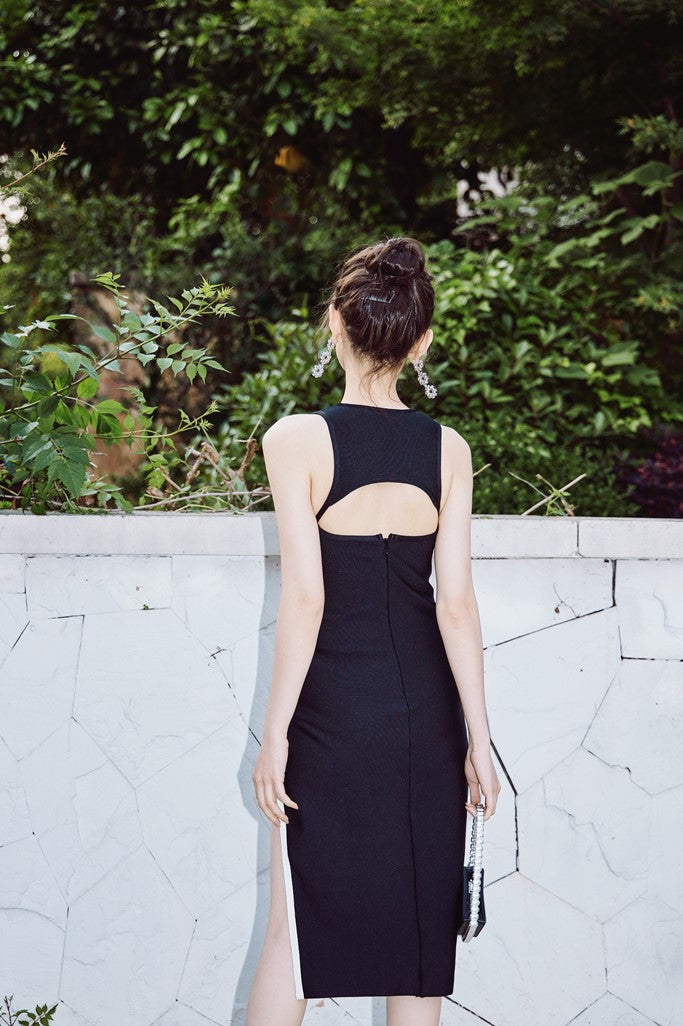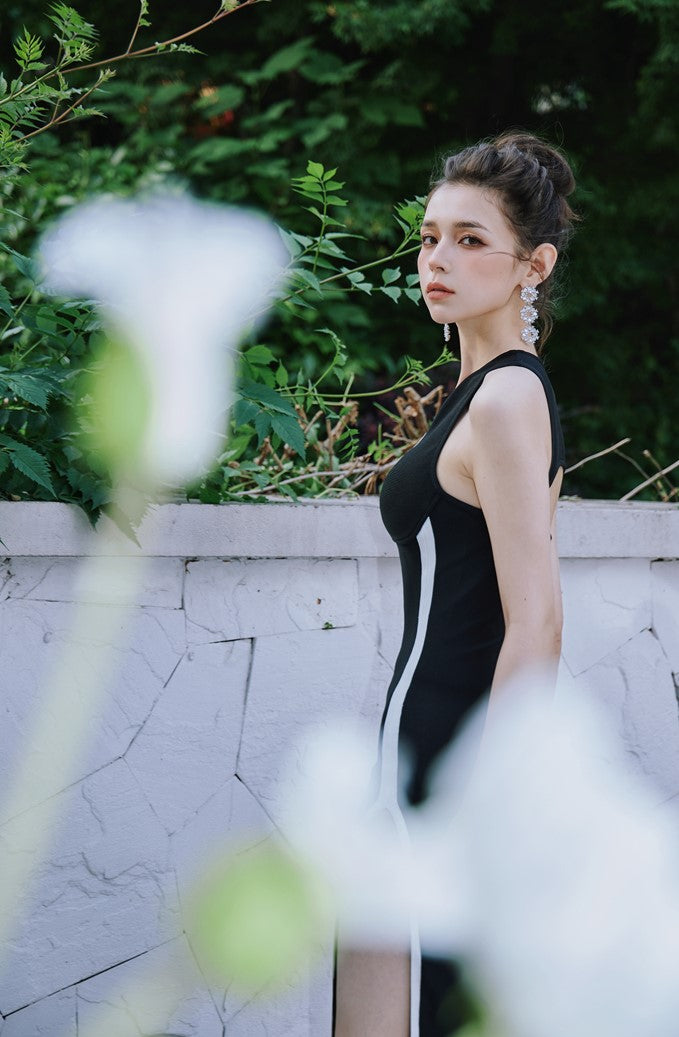 DOLLY High End Black and White V-Neck Sleeveless Slim Fit High Slit Sexy Dress-ESTER