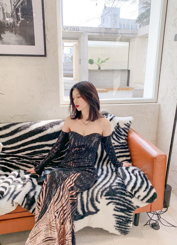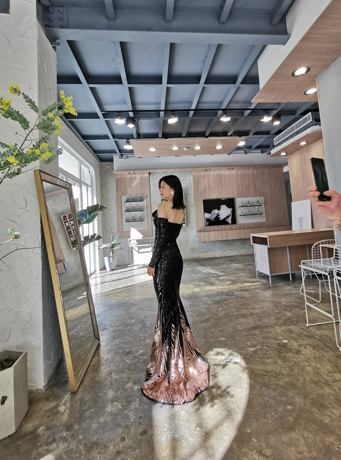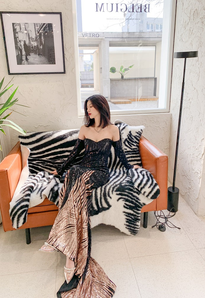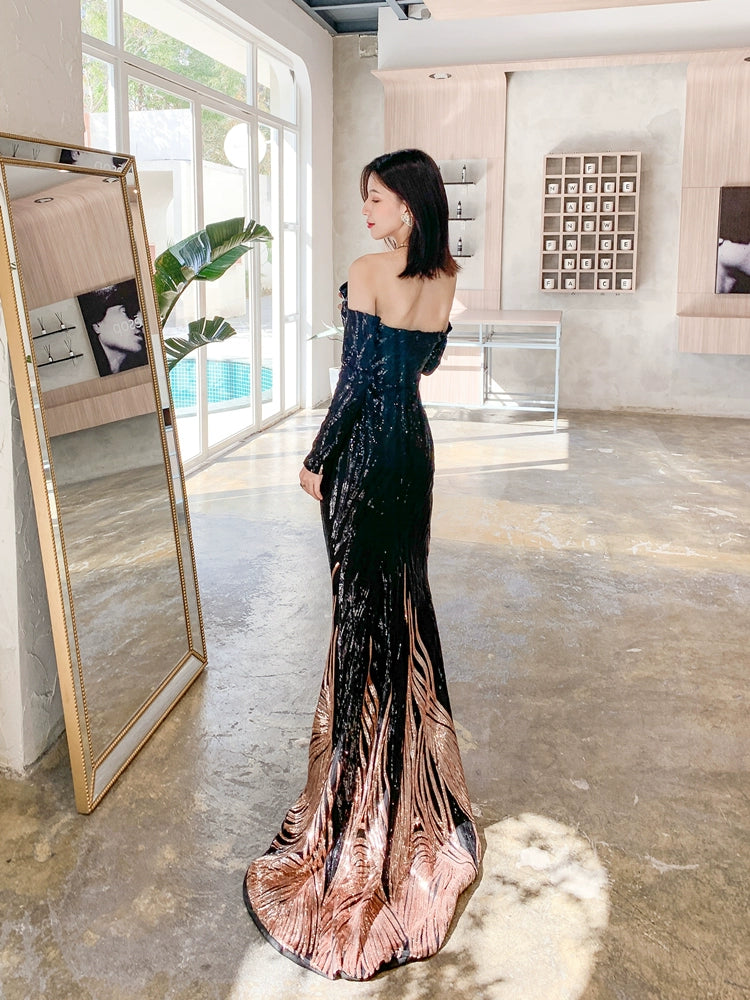 DOLLY High End Black Gold Chest Wrap Long Sleeve Off Shoulder Long Banquet Dress-KANTE