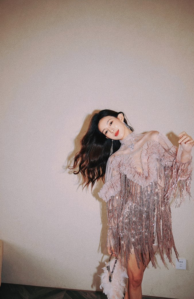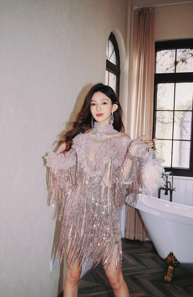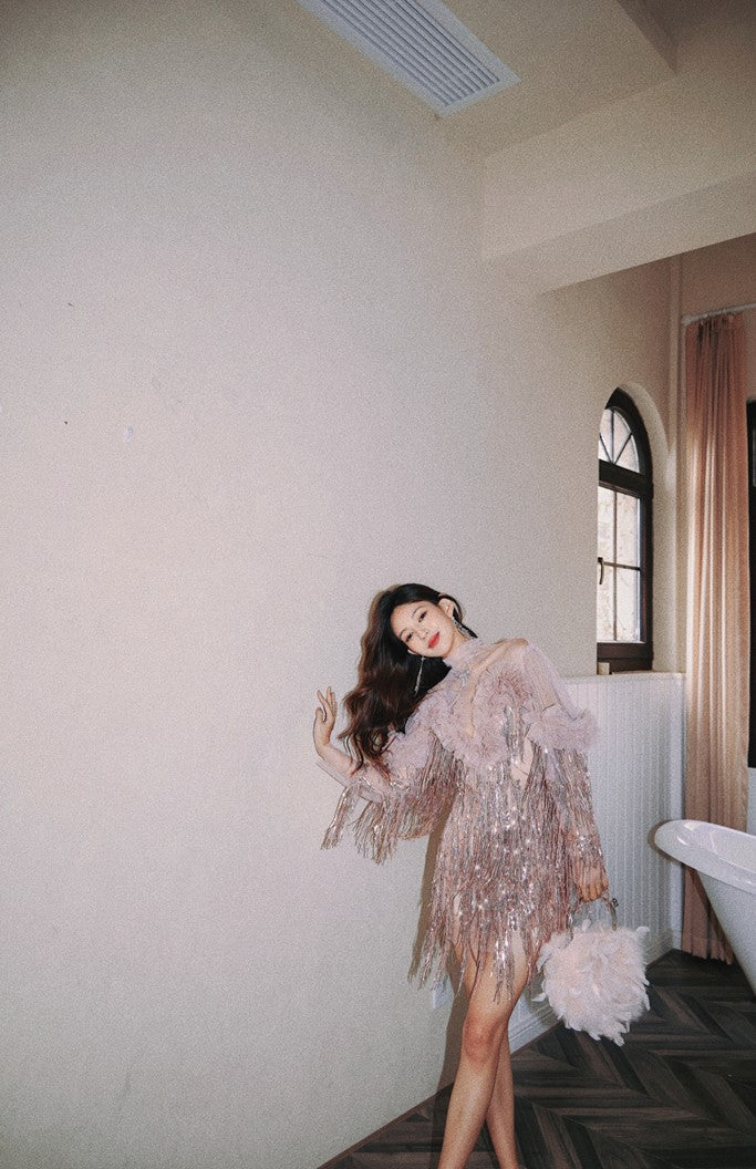 Introducing our DOLLY High End Retro Style Glitter Tassel Sequin Midi Birthday Dress-KHLOE. This classy and luxurious dress exudes sophistication and exclusivity. With its glitter and tassel details, it's sure to make a statement at any event. Elevate your wardrobe with this elegant dress.(v)
