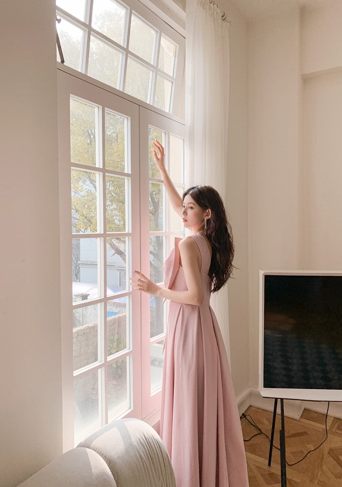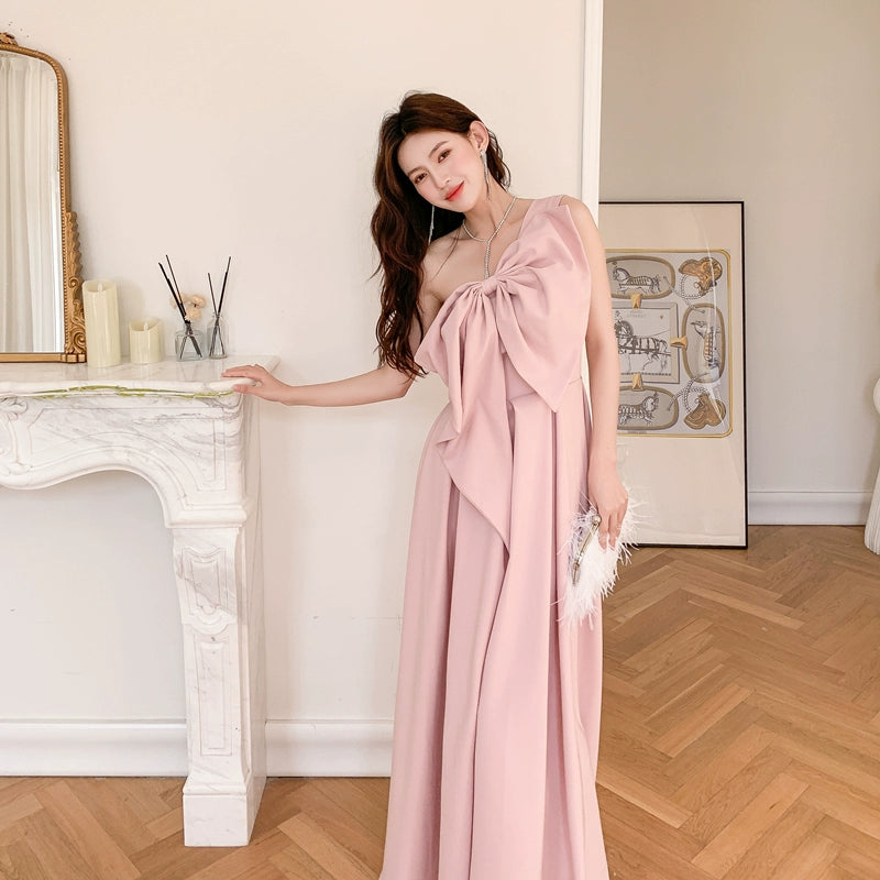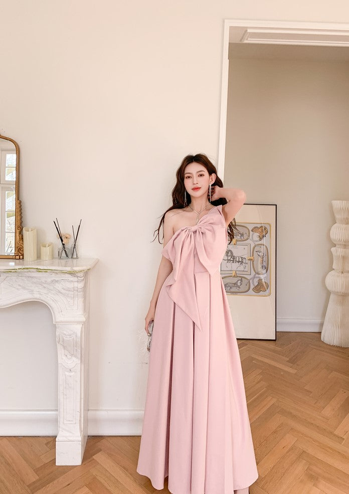 DOLLY High End Retro Style One Shoulder Big Bow Long Dinner Dress-KIKI