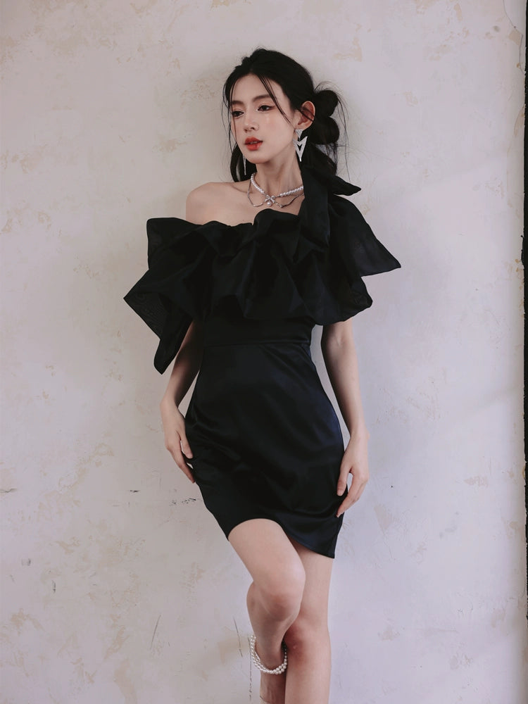 DOLLY Luxury Black Off Shoulder Slim Fit Short Ruffle Dinner Dress-MABEL