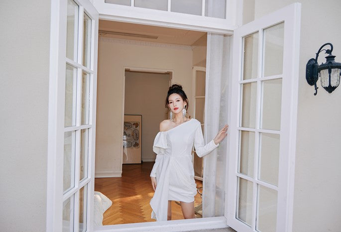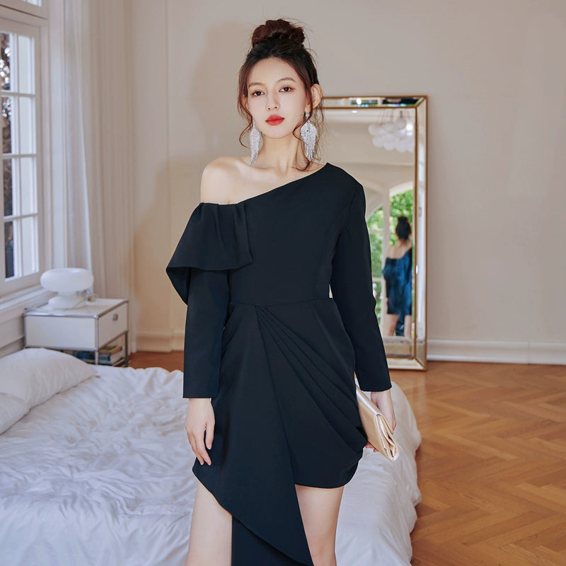 DOLLY Luxury Black Pleated One Shoulder Long Sleeve Irregular Midi Dress-RAIN