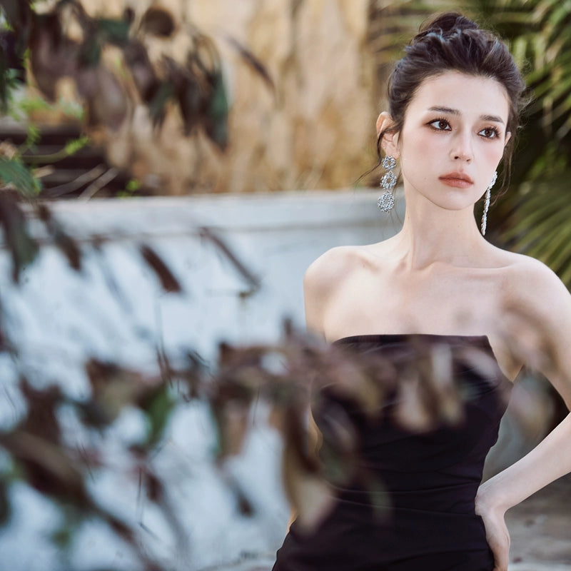 This sleek black design, pleated detailing, and slim-fit silhouette accentuates your figure. Perfect for a fancy dinner, the sleeveless chest wrap adds a touch of sexiness. Expertly crafted with luxurious materials, this dress will elevate your style to new heights.