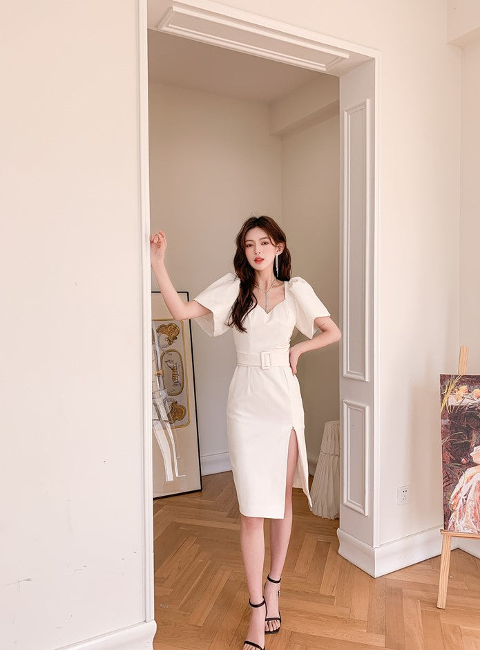 DOLLY Luxury Black Retro V-Neck Short Puff Sleeve Midi Luncheon Dress-SUSU