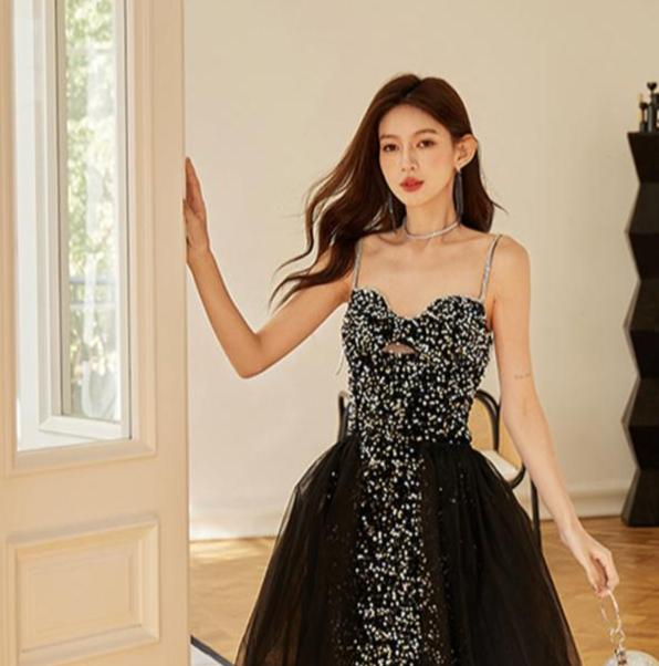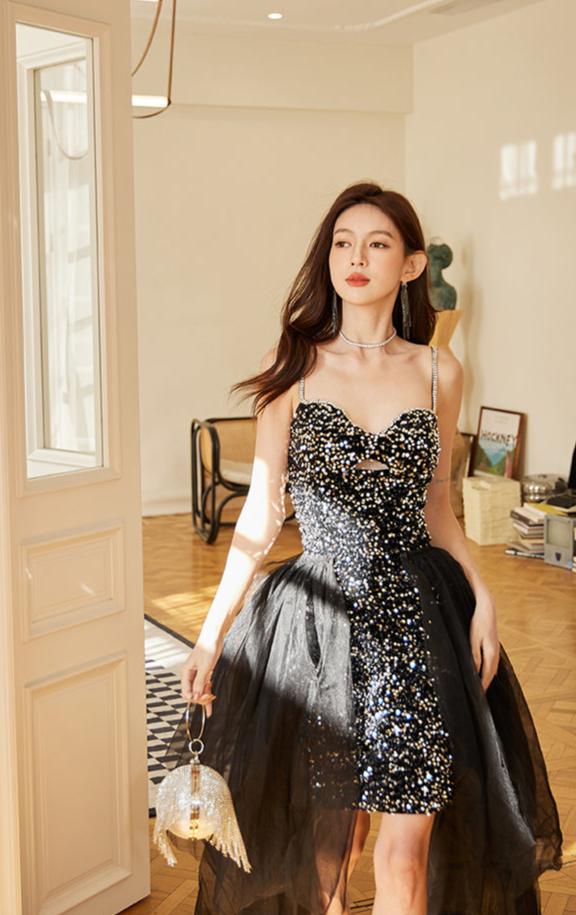 DOLLY Luxury Black Sleeveless Sequin Mesh Ribbon Birthday Dress-CARAMEL