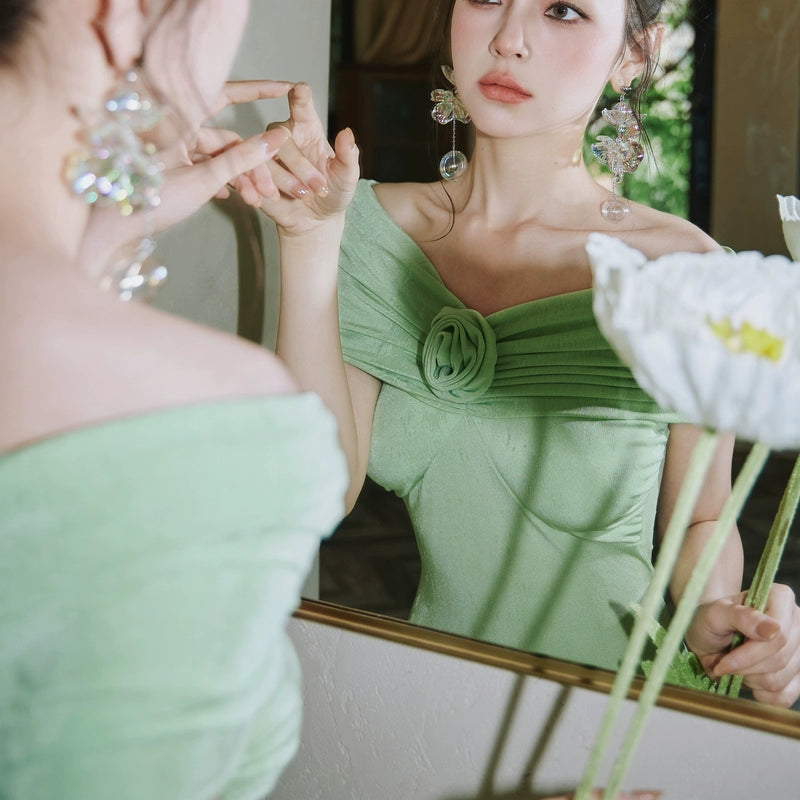 Introducing the DOLLY Luxury French Style Off Shoulder Short Sleeve Hip Wrap Dinner Dress-ANTHEA. This elegant and gorgeous dress exudes sophistication and style, making it the perfect choice for any dinner event. With its off shoulder design and hip wrap, it is guaranteed to make you stand out in the crowd. (v)