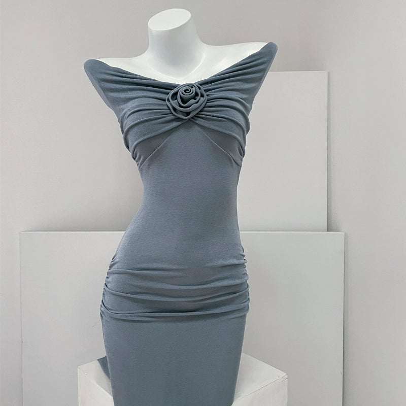 DOLLY Luxury French Style Off Shoulder Short Sleeve Hip Wrap Dinner Dress-ANTHEA