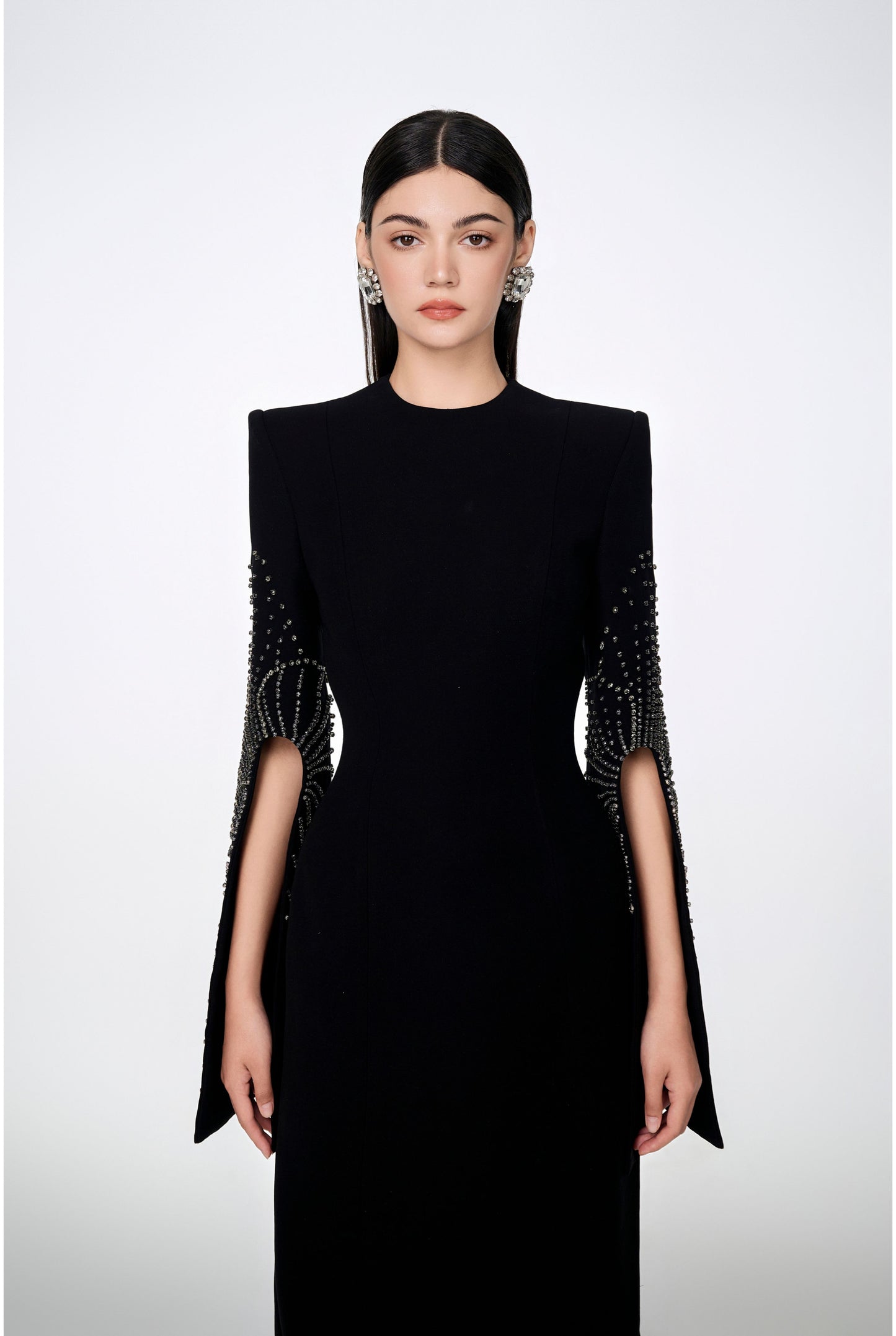 Loyal to its commitment to modern, dynamic and chic fashion, Tracy Studio presents a stunning bodycon dress with stone embellishment on sleeves which are slit for wearers' convenience. The dress is a blend of advanced tailoring techniques and meticulous attention to detail. Perfect for parties and special events, this dress is sure to turn heads and make a bold fashion statement.