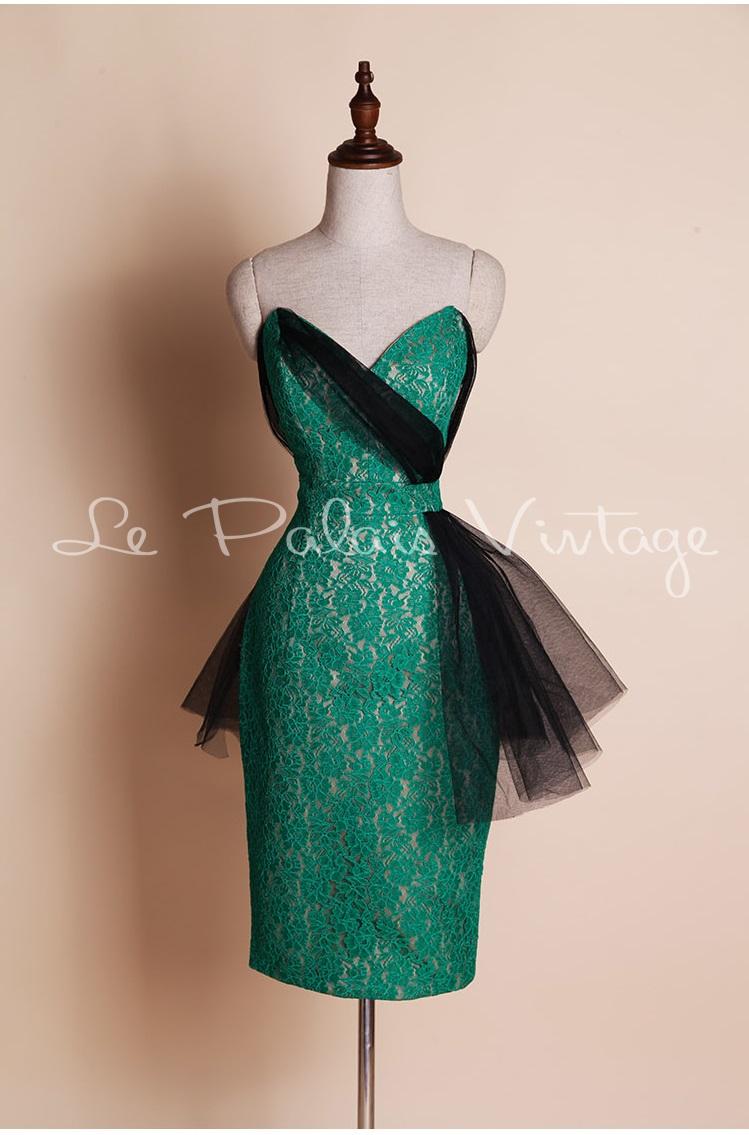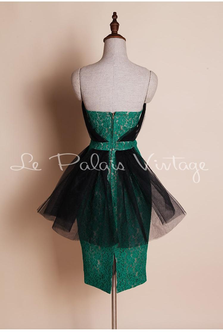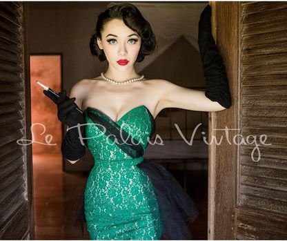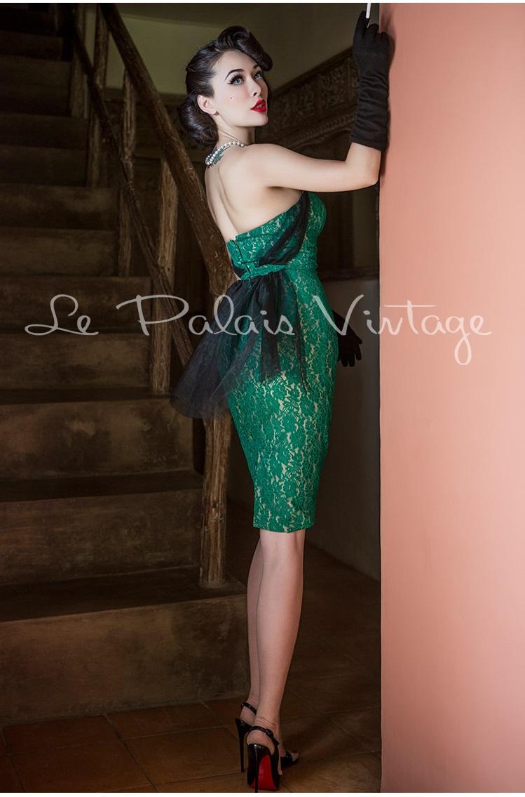 Elegant vintage retro pin up green sweetheart neckline fishbone lace dress - Tivli