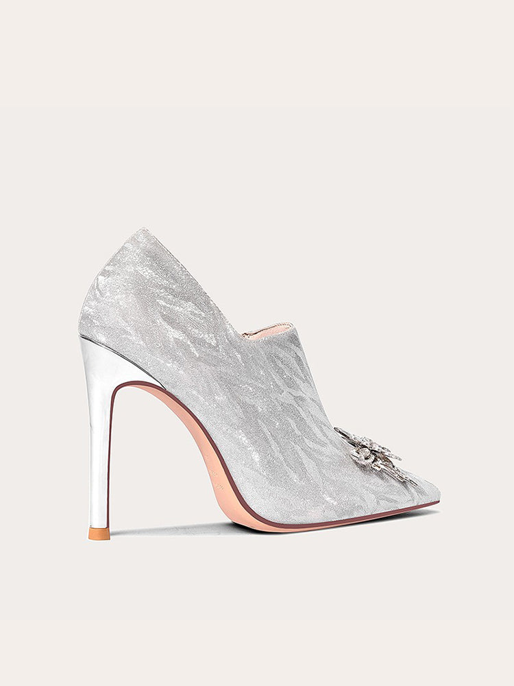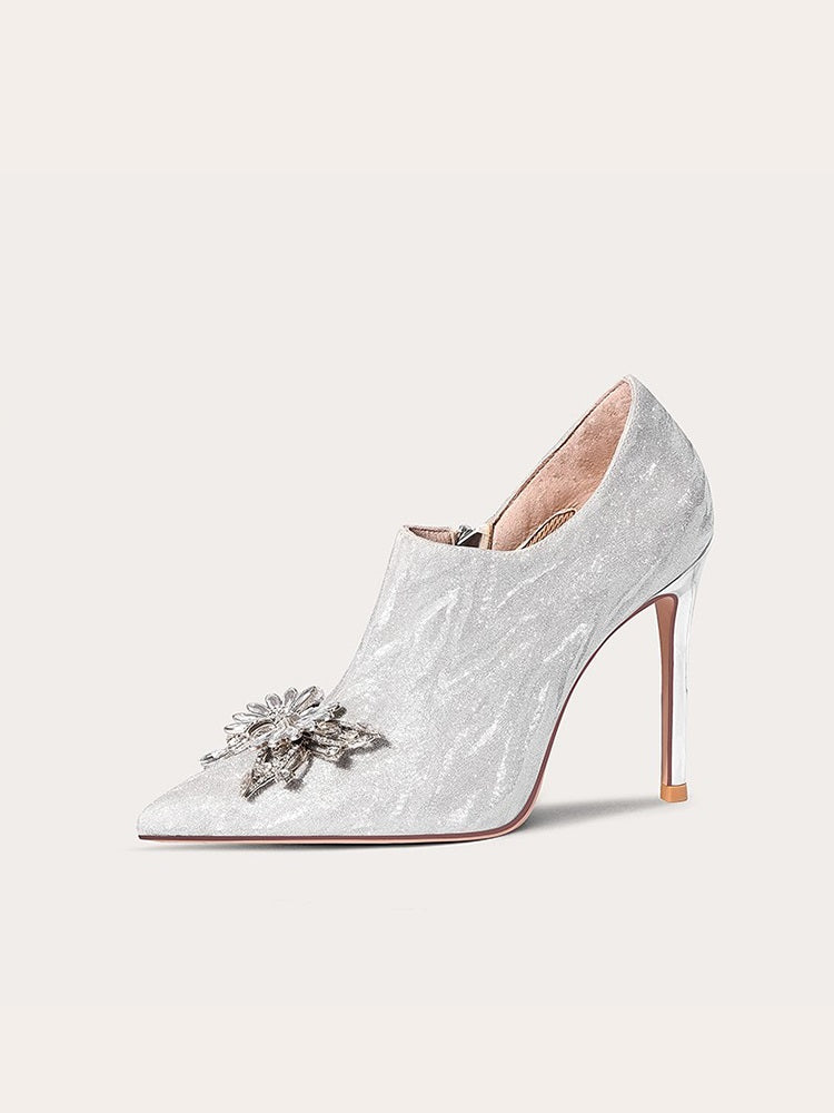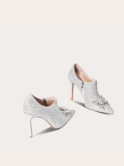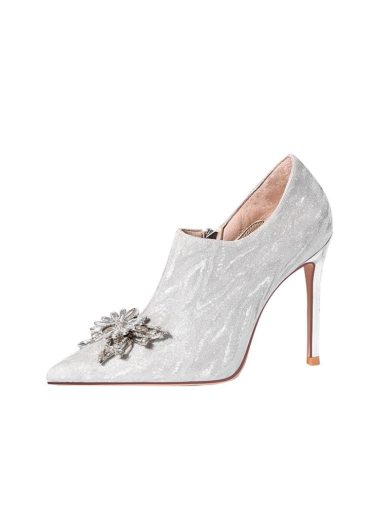 A sophisticated closure is provided by a side zipper while the shaft height of these ankle boots provides extra support. This fashion boot design is accented with metal rhinestones, and a super high heel (greater than 8cm) to make a statement. Pointed toes with a regular thickness and fine heel make these shoes comfortable to wear. The sole material is constructed with rubber, while the upper inner material and insole material are made of luxurious first layer pigskin. Glitter leather is used on the help surface along with microfiber on the boot surface and first layer material in the boot tube inner.