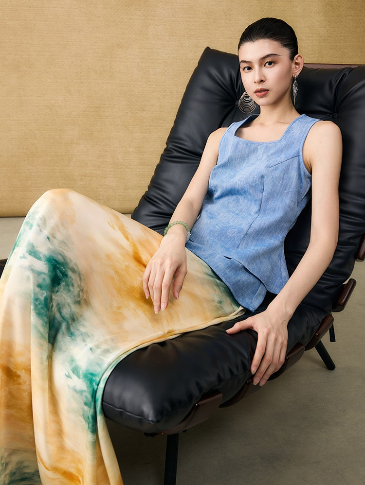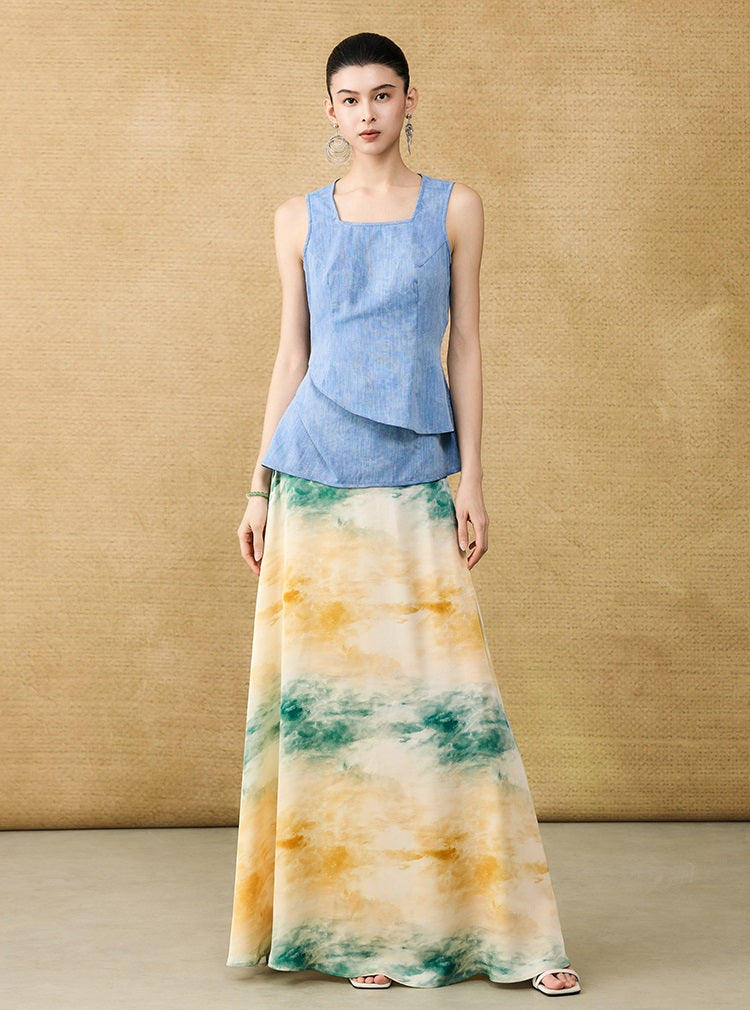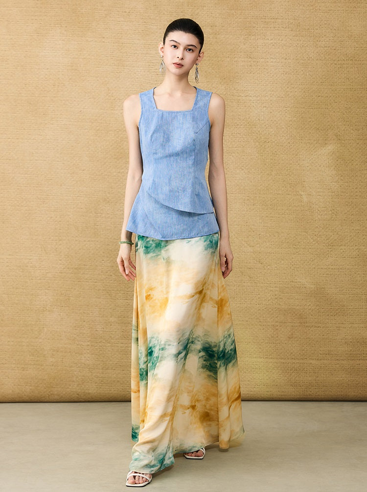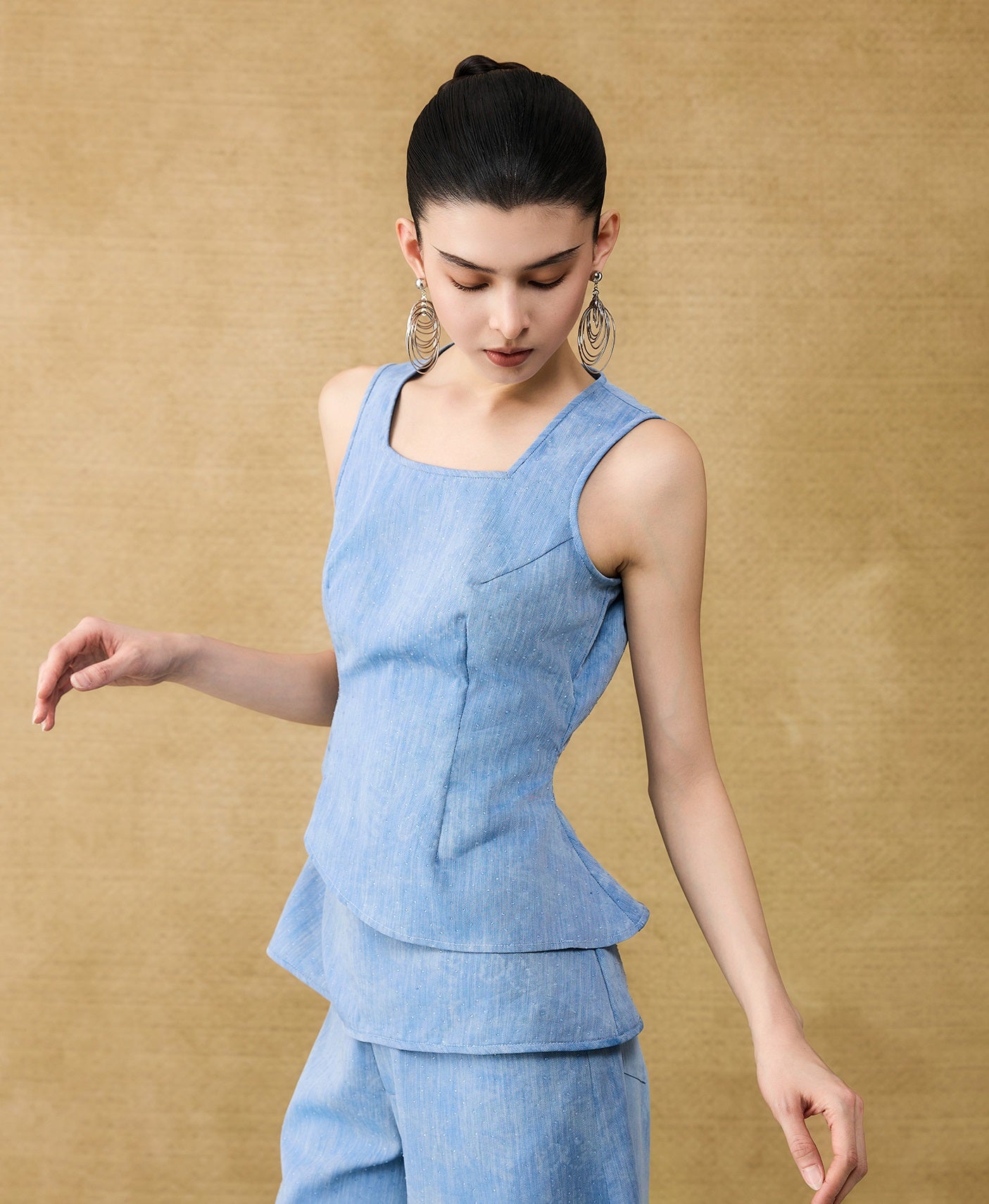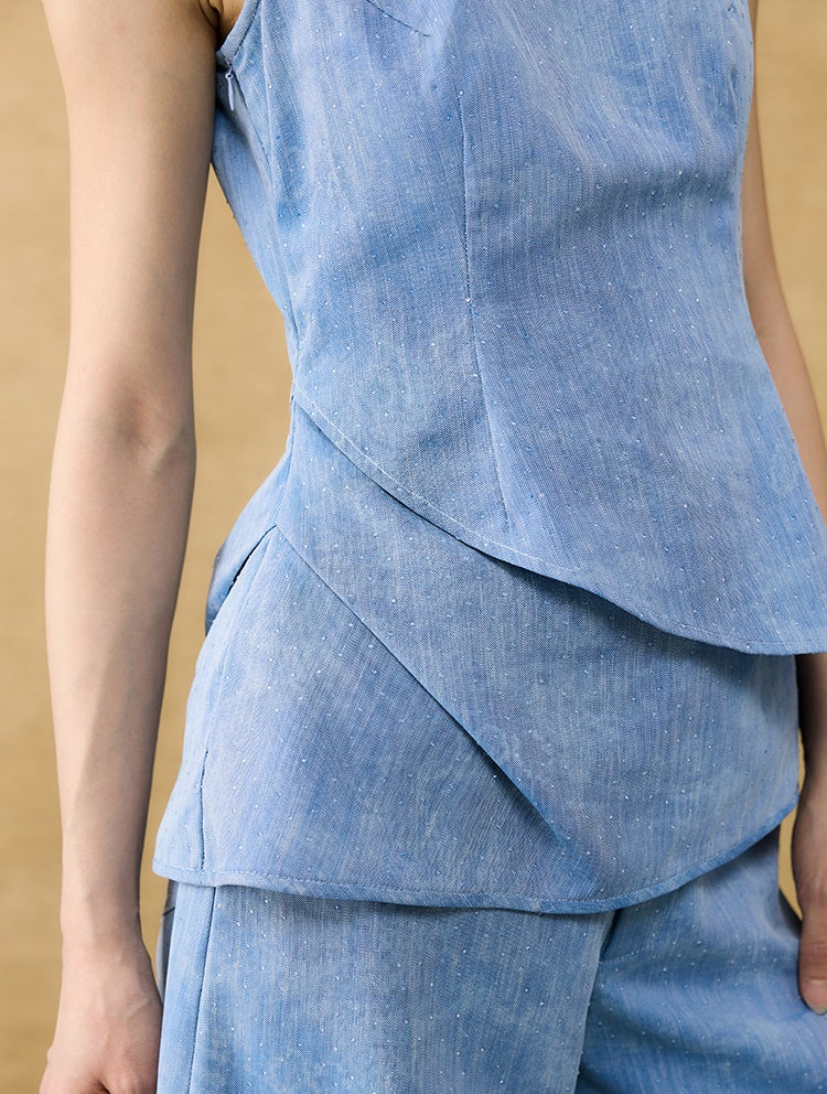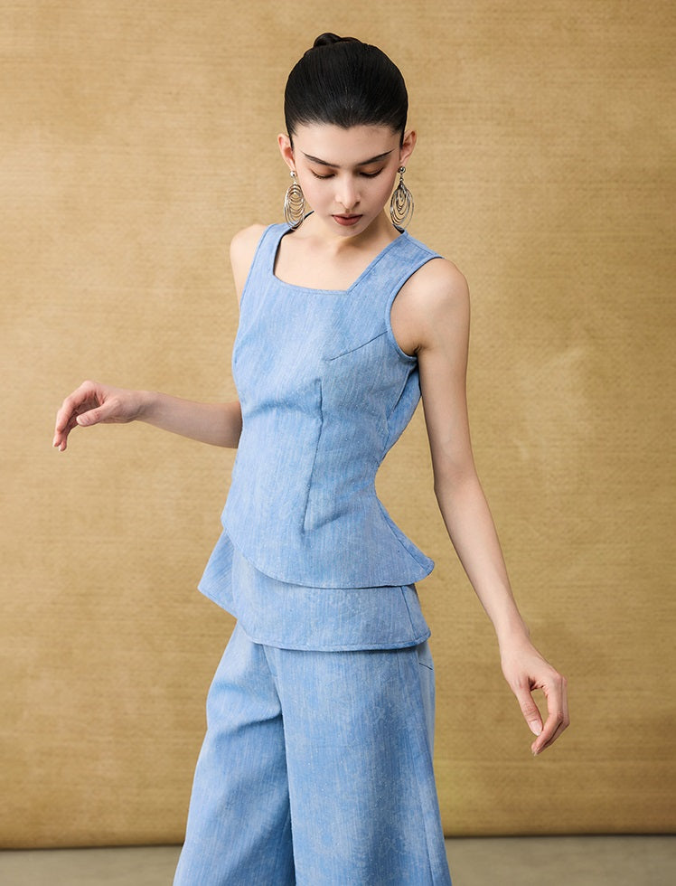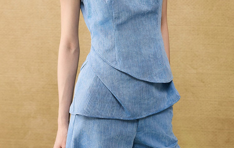 This sleeveless summer top features a square neckline and a layered peplum design that adds dimension and movement. Enhanced with a subtle glitter diamond blend, it offers a refined shimmer perfect for warm-weather occasions. Lightweight and stylish, it combines elegance with breathability for effortless summer sophistication.