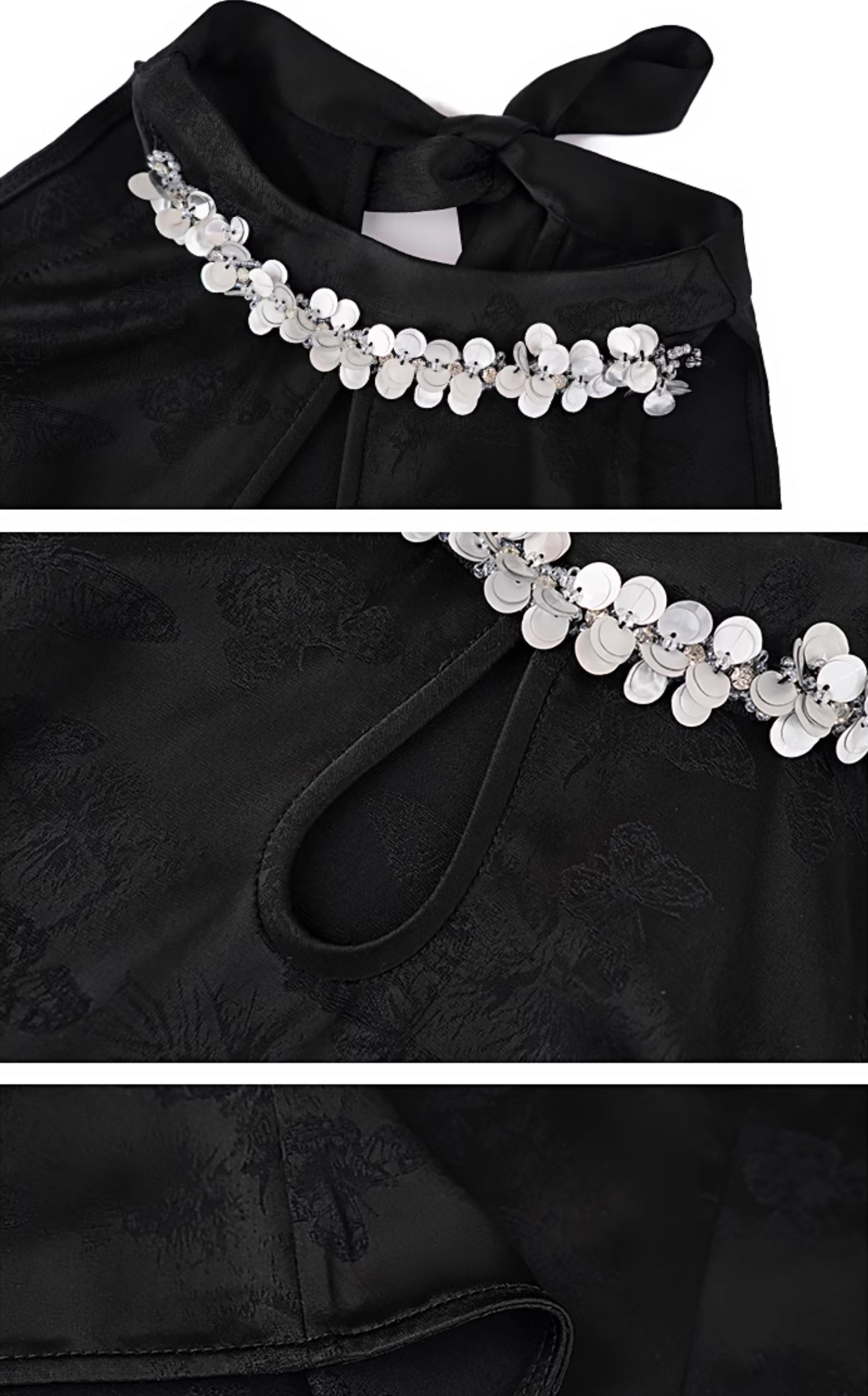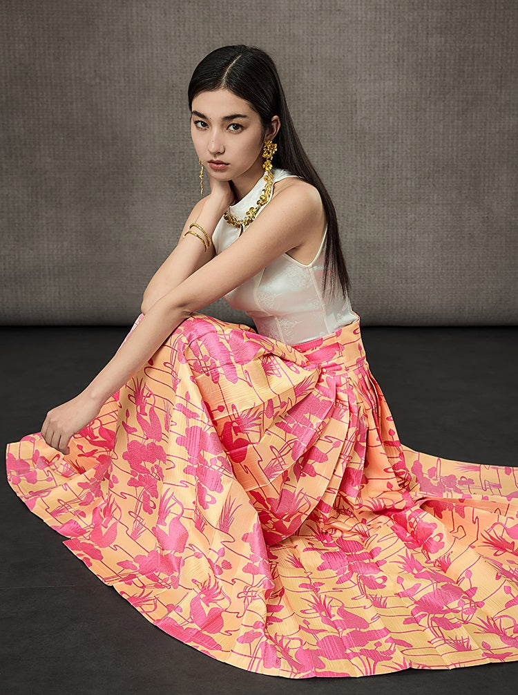 This HECO [Dancing Butterfly] top and skirt set features the chic and elegant combination of a sleeveless top and long skirt. In vibrant yellow, black, white, and red colors, this outfit is perfect for any event and will add a touch of class to your wardrobe. Made with a new Chinese hollow lace design, it's the perfect choice for a fashionable and stylish look.