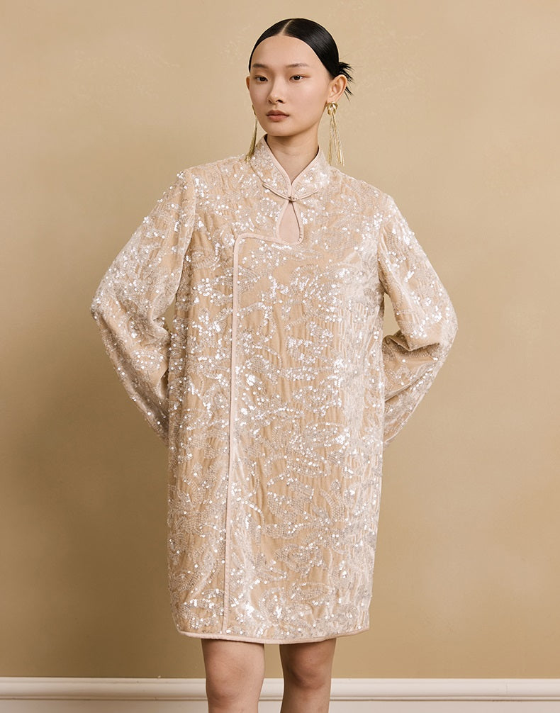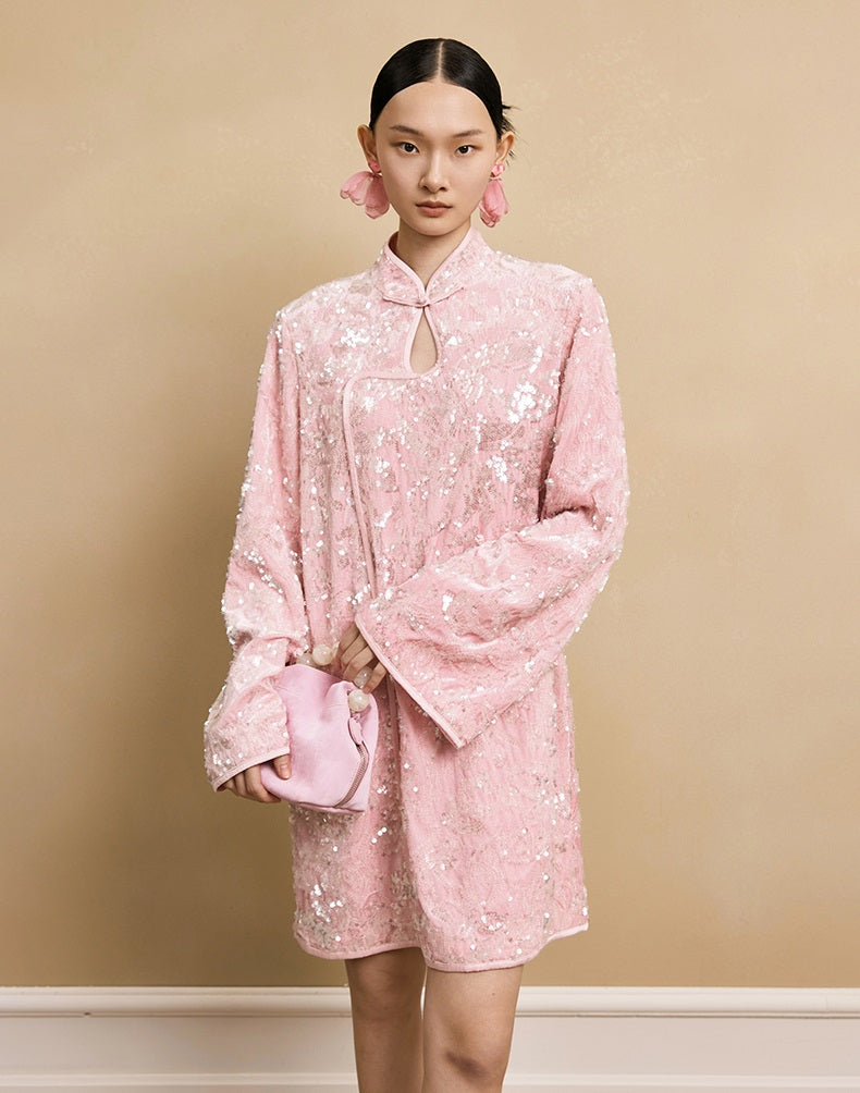 Ready for an adventure in style? HECO's dress will have you turning heads with its graceful sequins embroidery. Made with 100% polyester and featuring a traditional Chinese collar and a midi length, this dress is perfect for adding a touch of boldness to your wardrobe. Available in black, white, pink, and khaki.