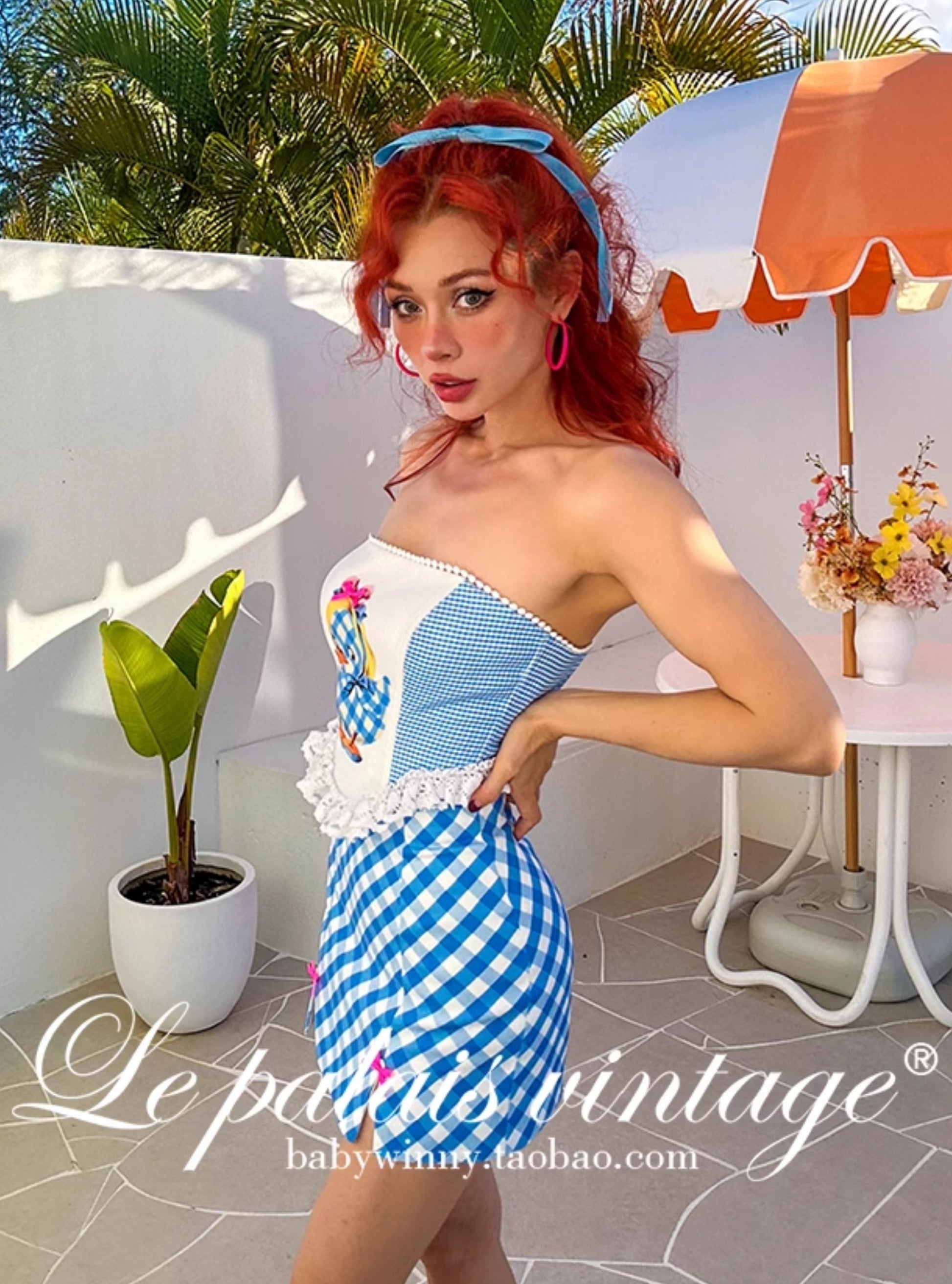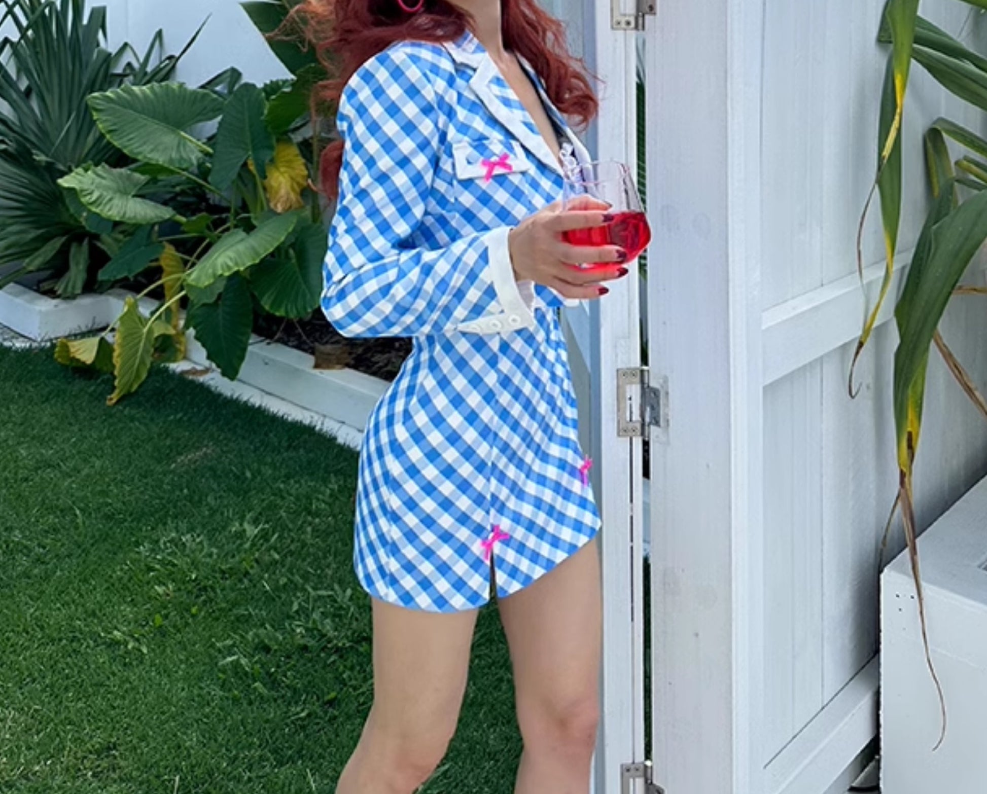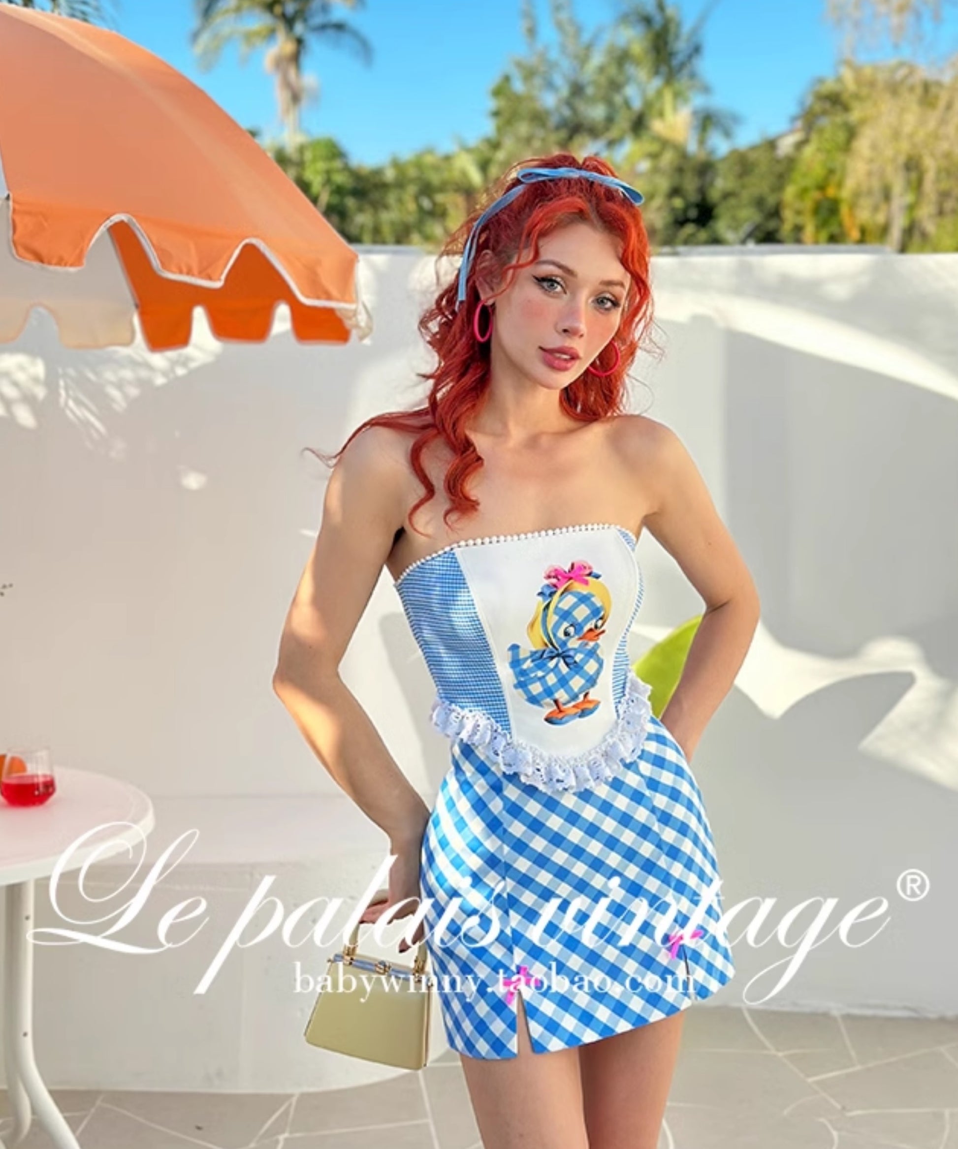 Le Palais Blue Plaid Small Fragrance Thin Short Coat + Short Skirt- Yuno