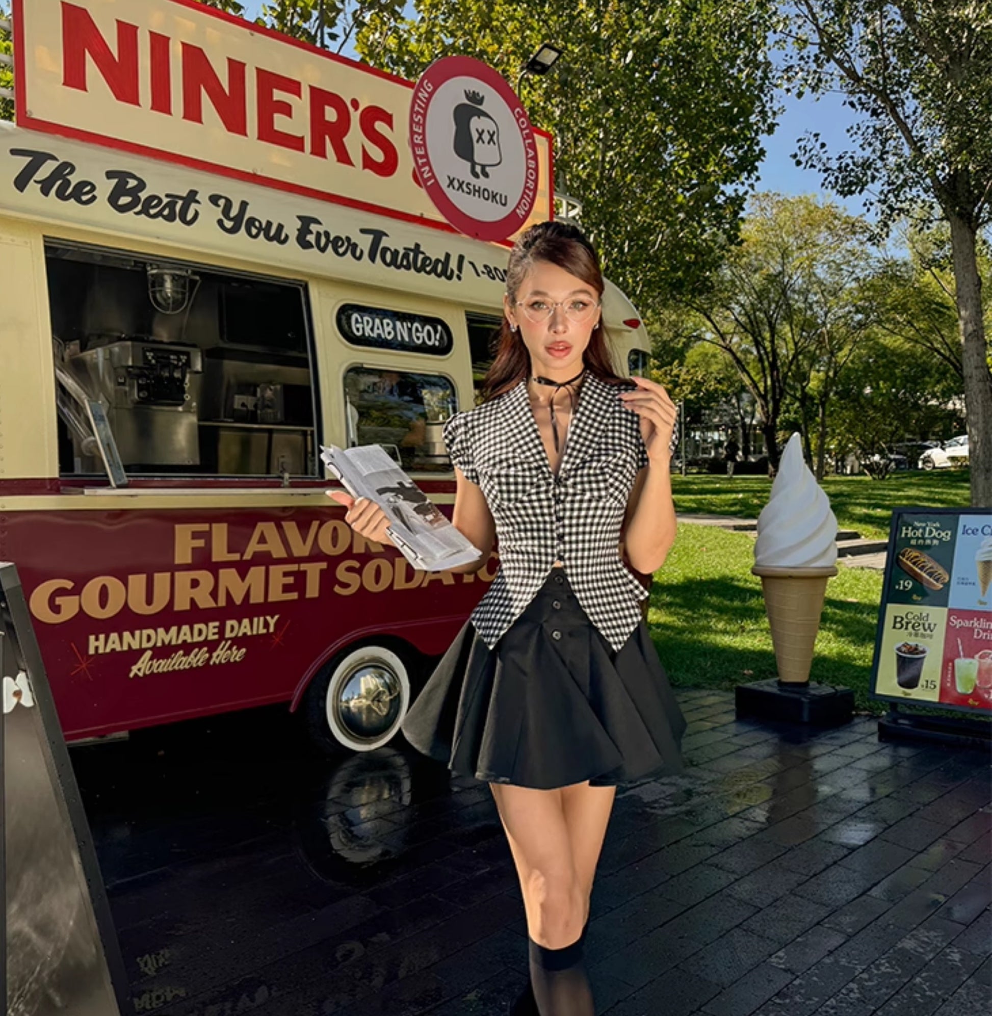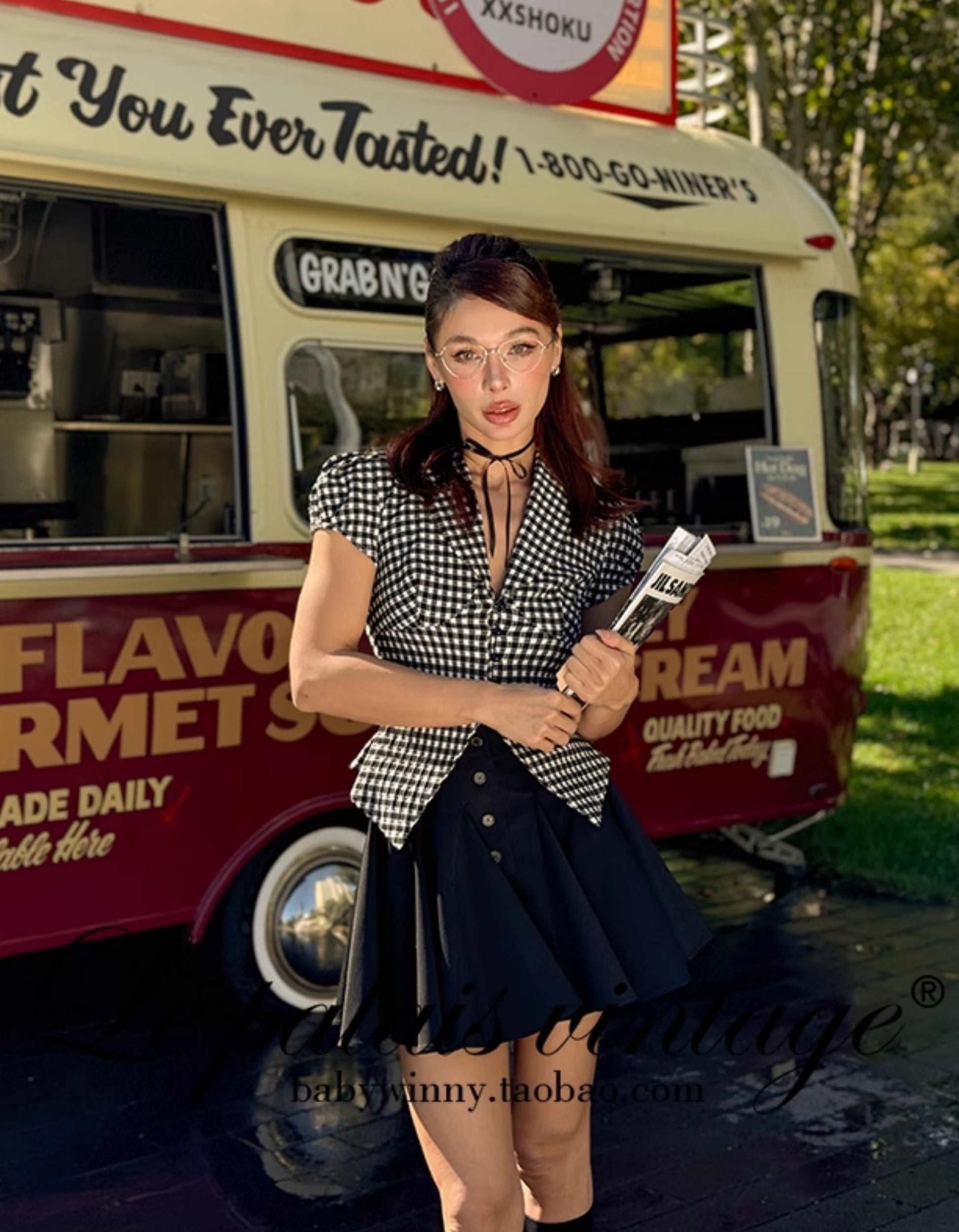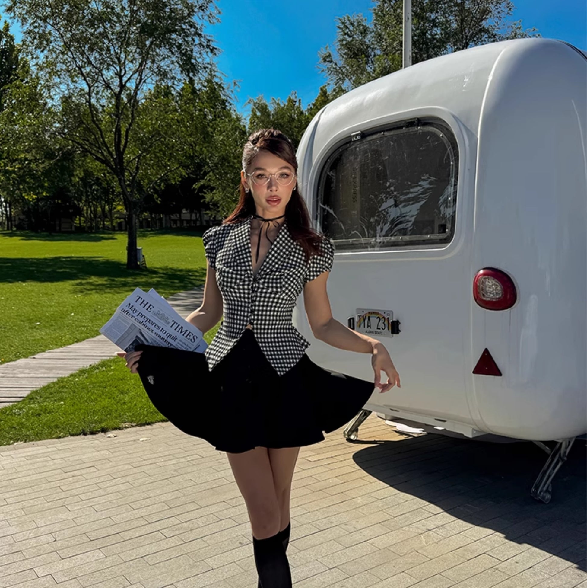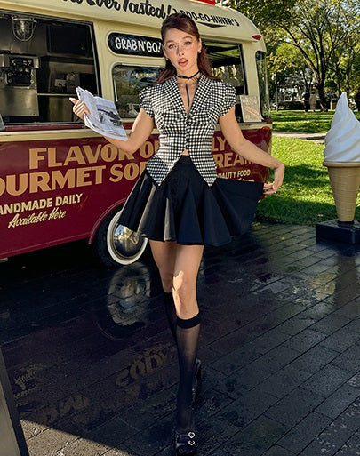 Le Palais Vintage Black & White Plaid Slim Puff Sleeve Shirt-ARARAGI.
