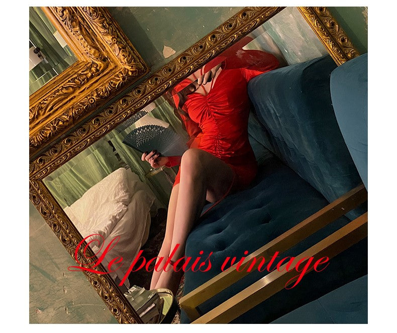 Le Palais Vintage High End Red Long Sleeve Satin V-neck Pleated Party dress-Ruby